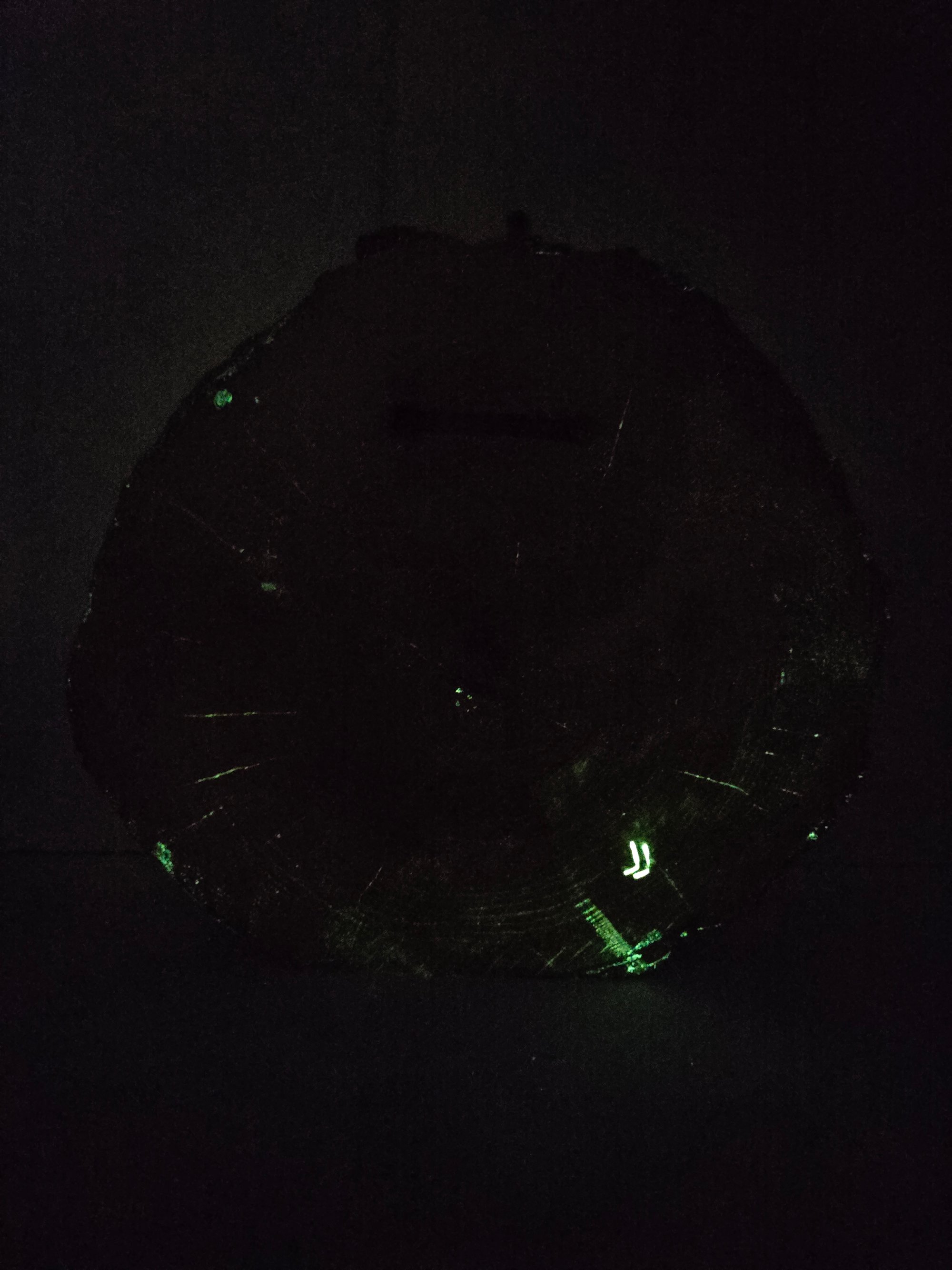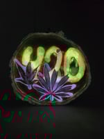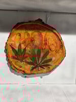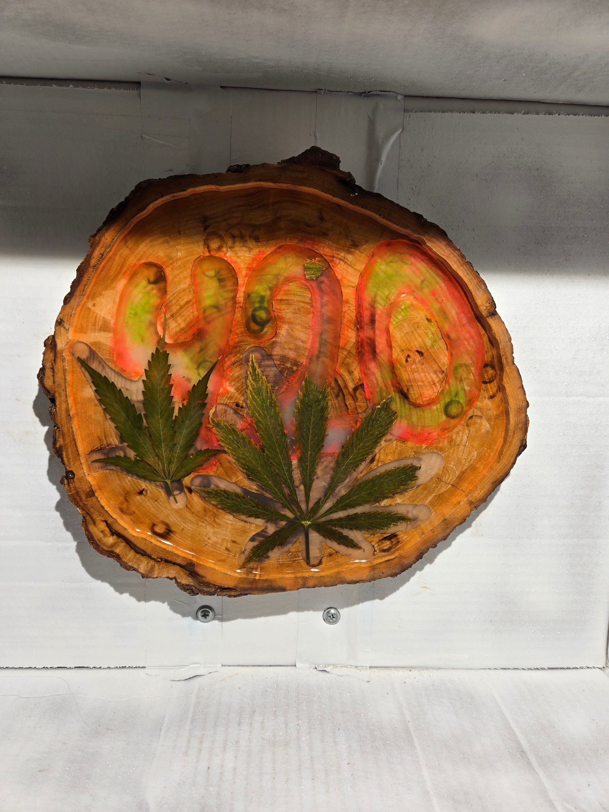 Handcrafted wood tray that glows in the dark and has real cannabis leaves encased in epoxy