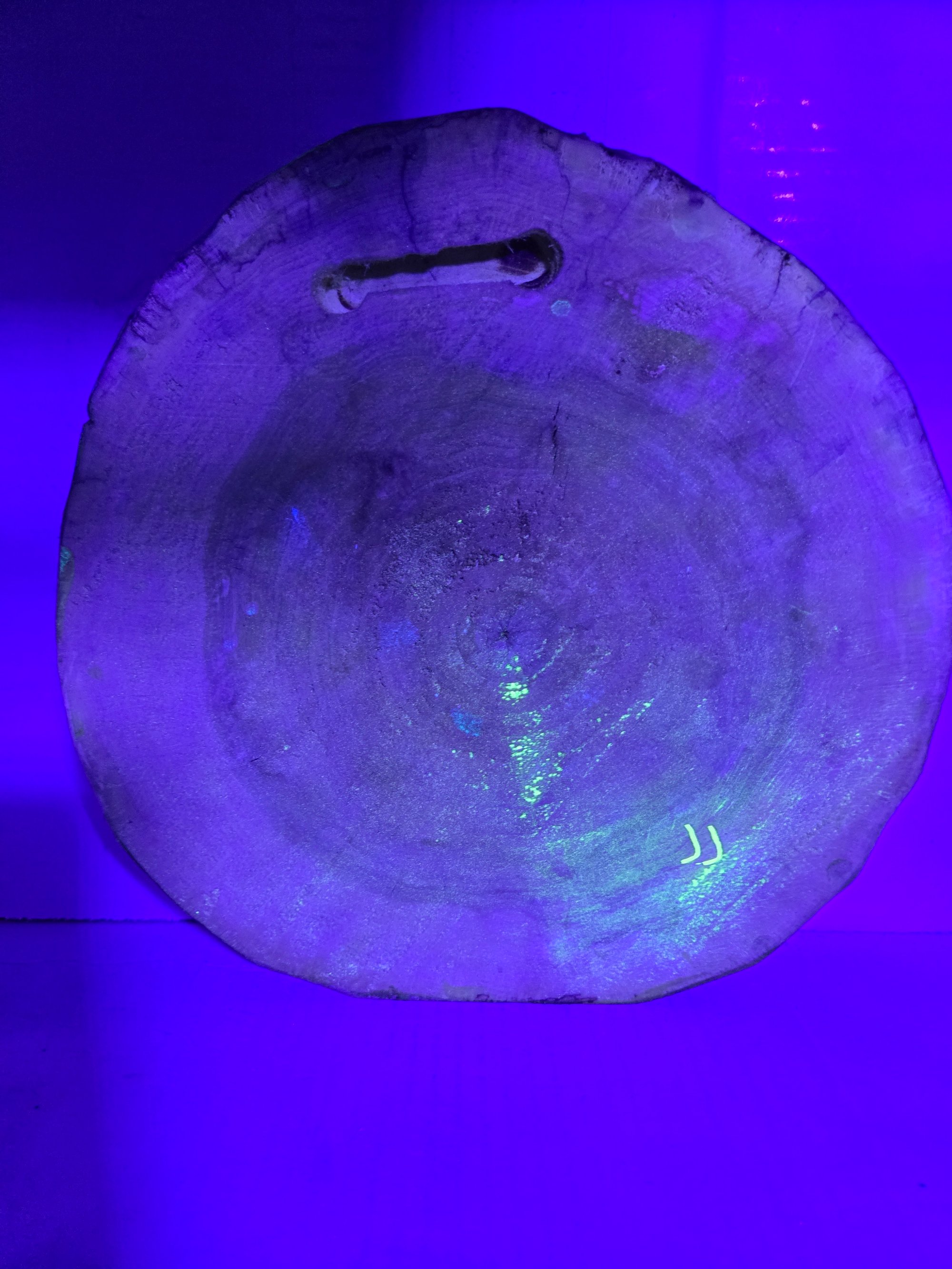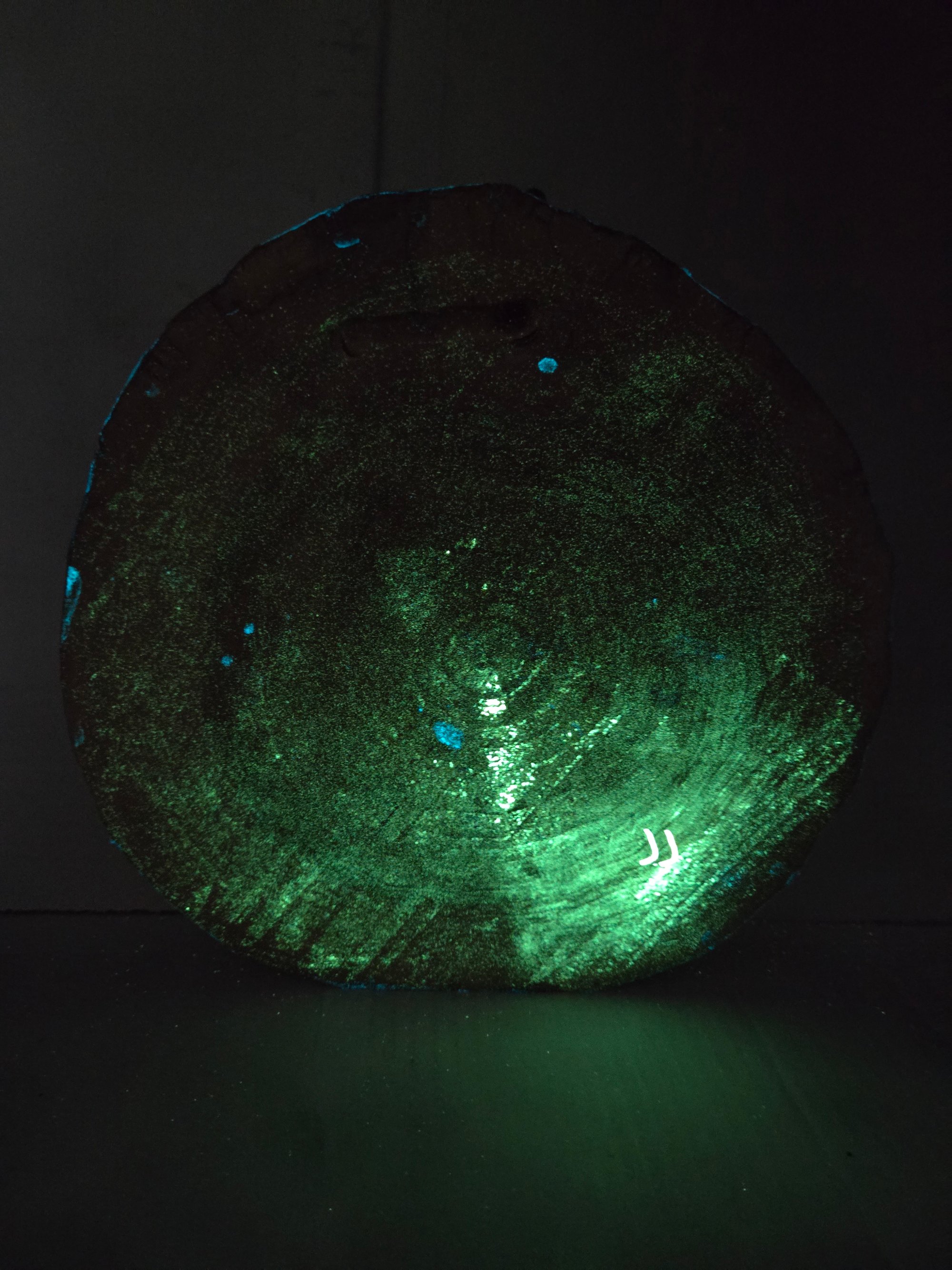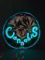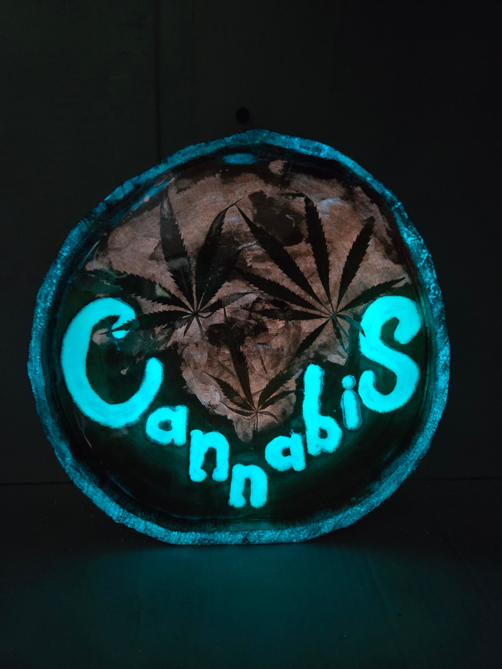 Handcrafted wood tray that glows in the dark and has real cannabis leaves encased in epoxy