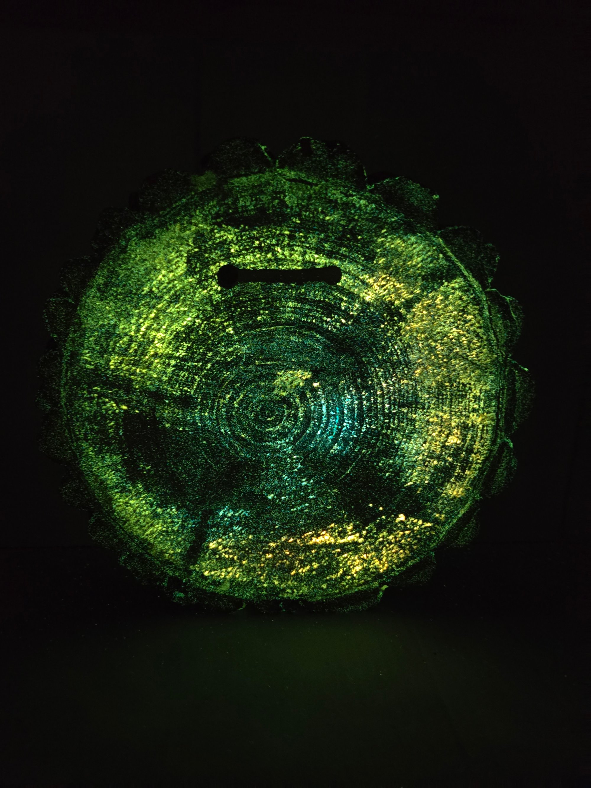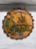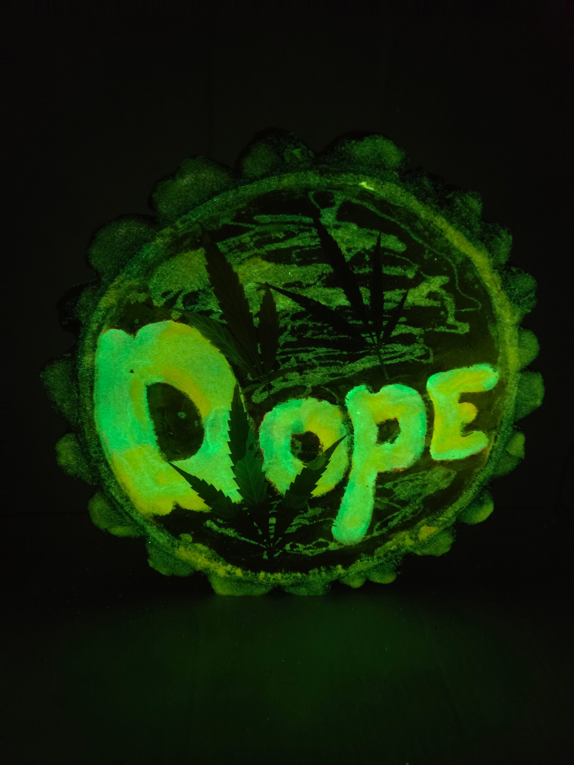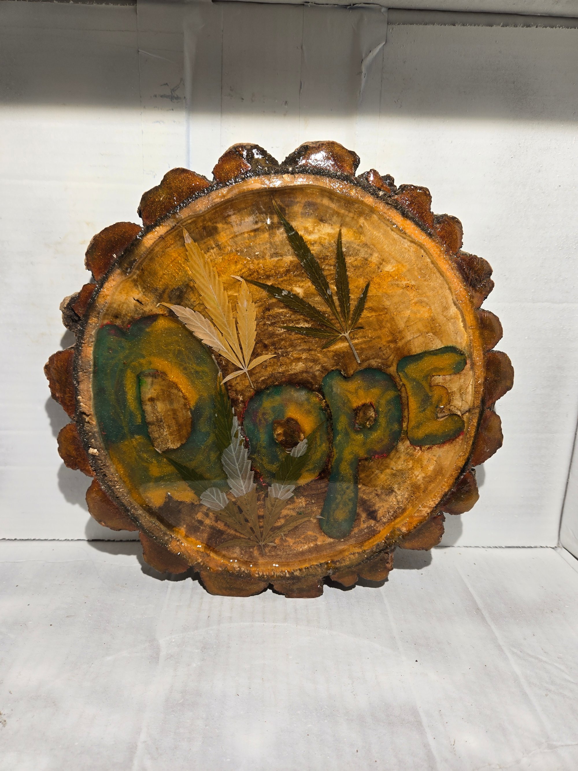 Handcrafted wood tray that glows in the dark and has real cannabis leaves encased in epoxy