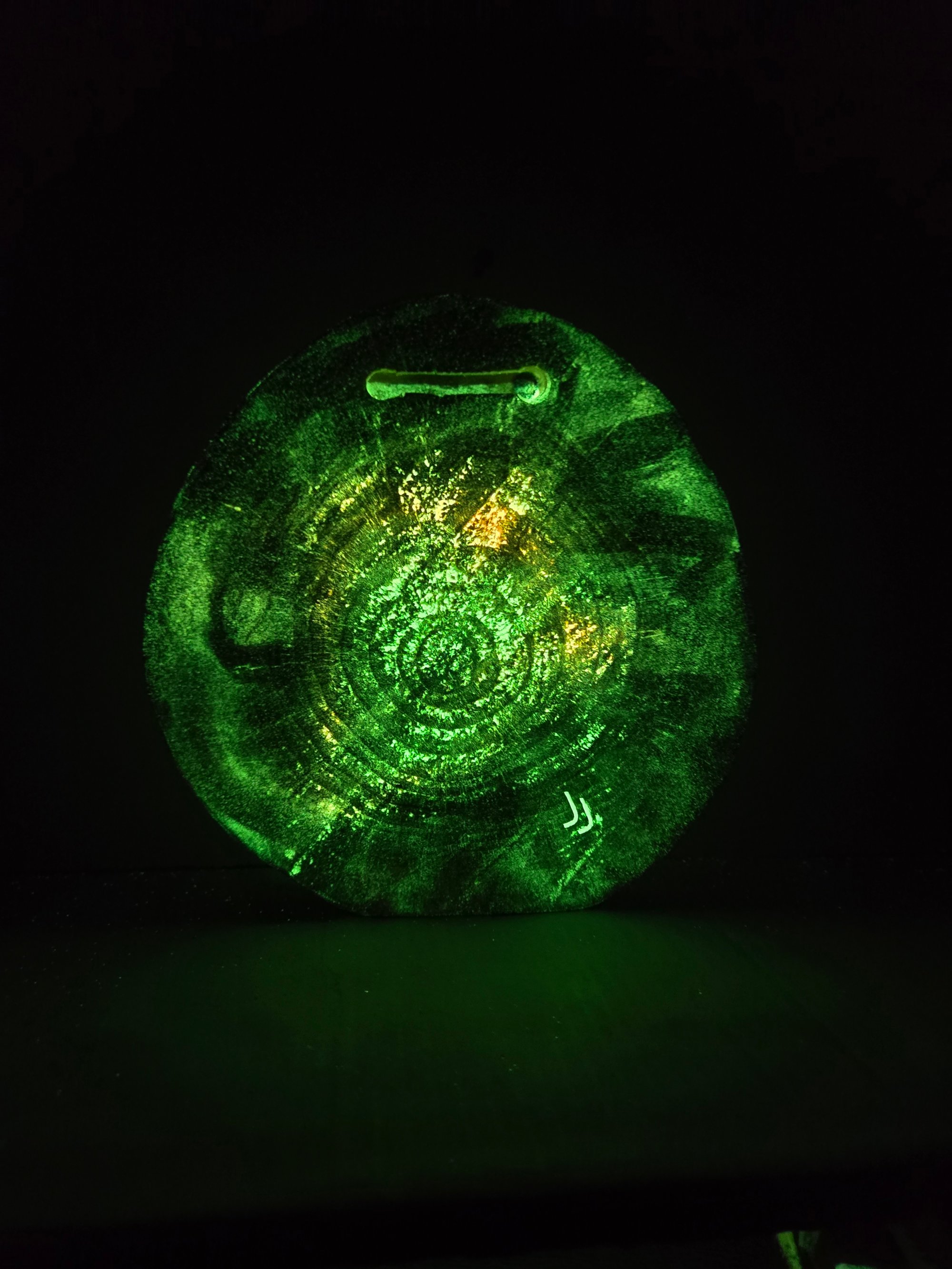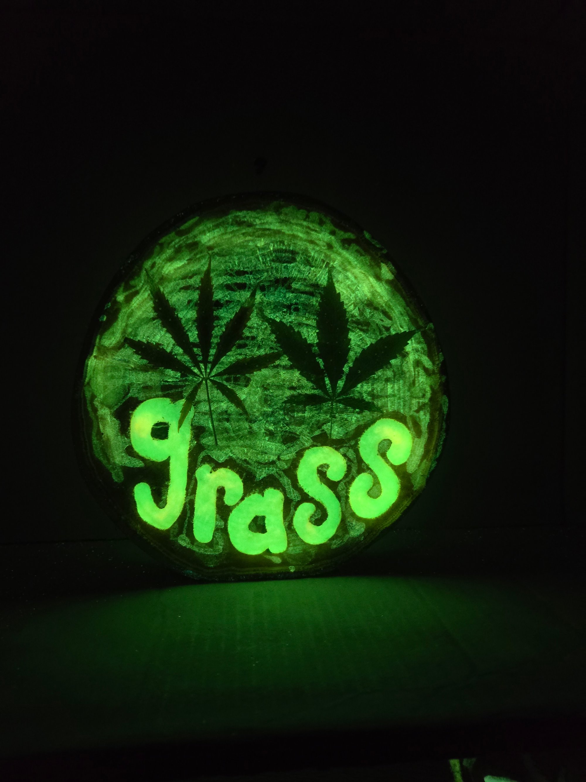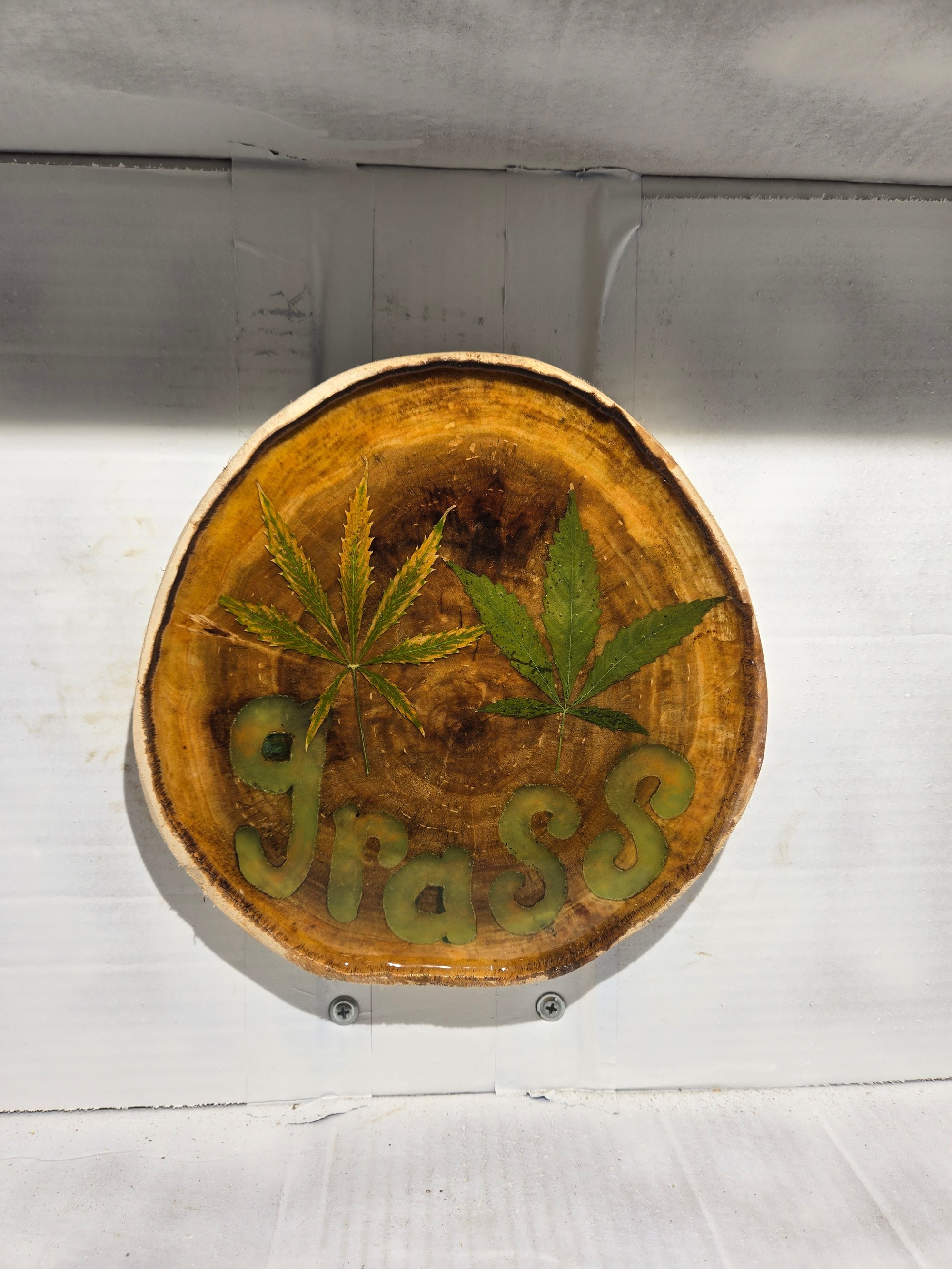 Handcrafted wood tray that glows in the dark and has real cannabis leaves encased in epoxy