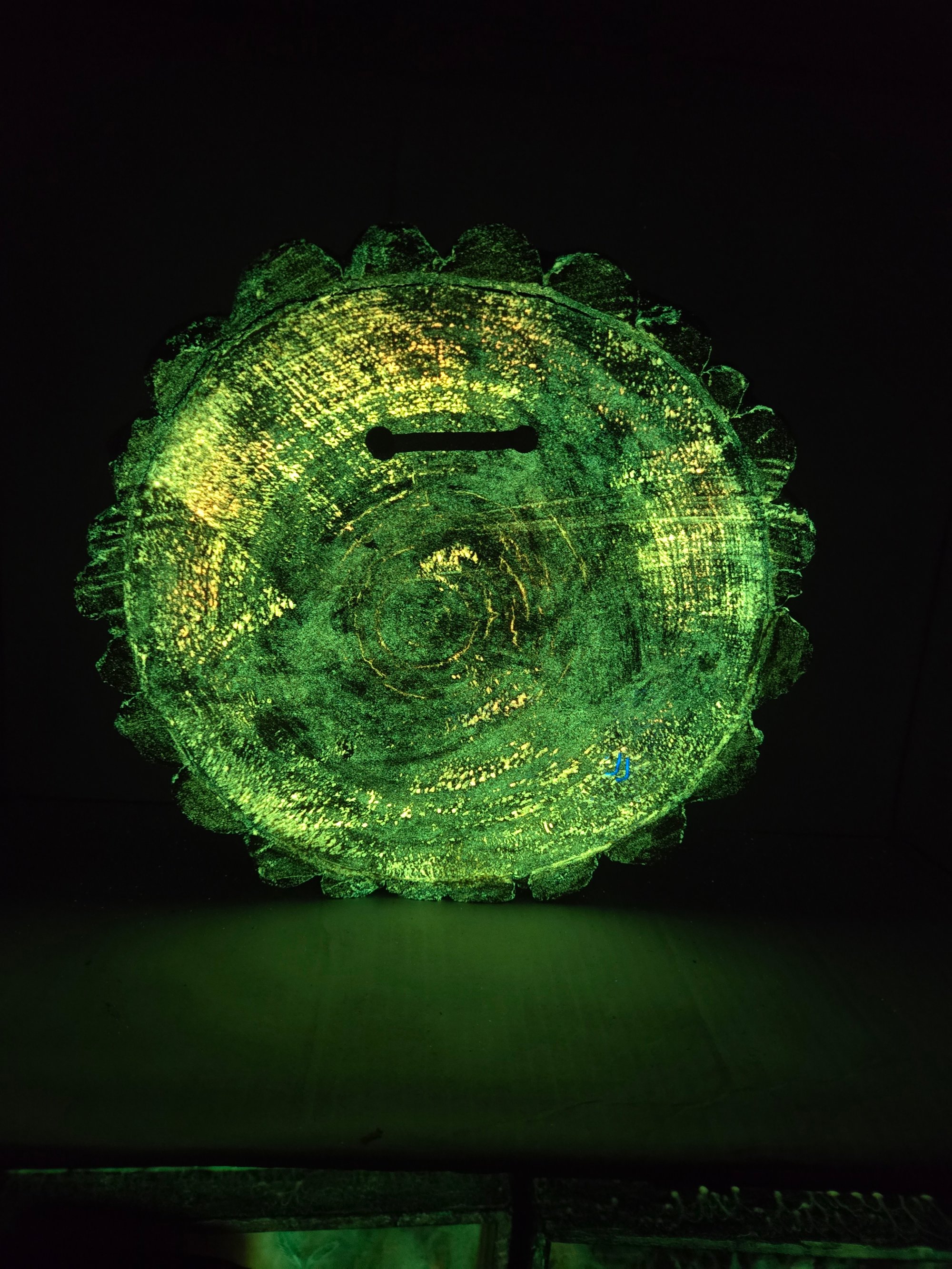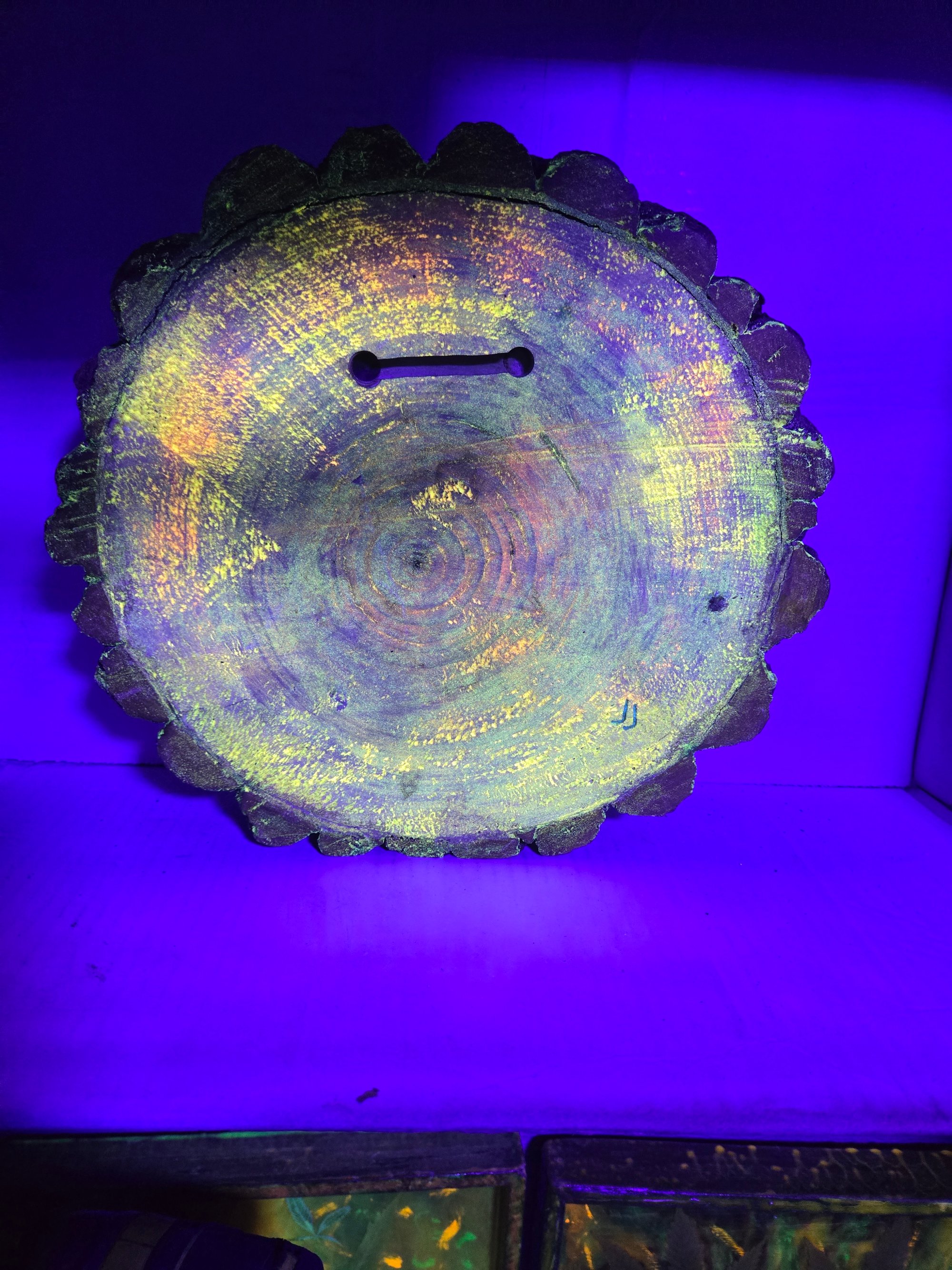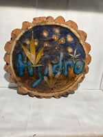 Handcrafted wood tray that glows in the dark and has real cannabis leaves encased in epoxy