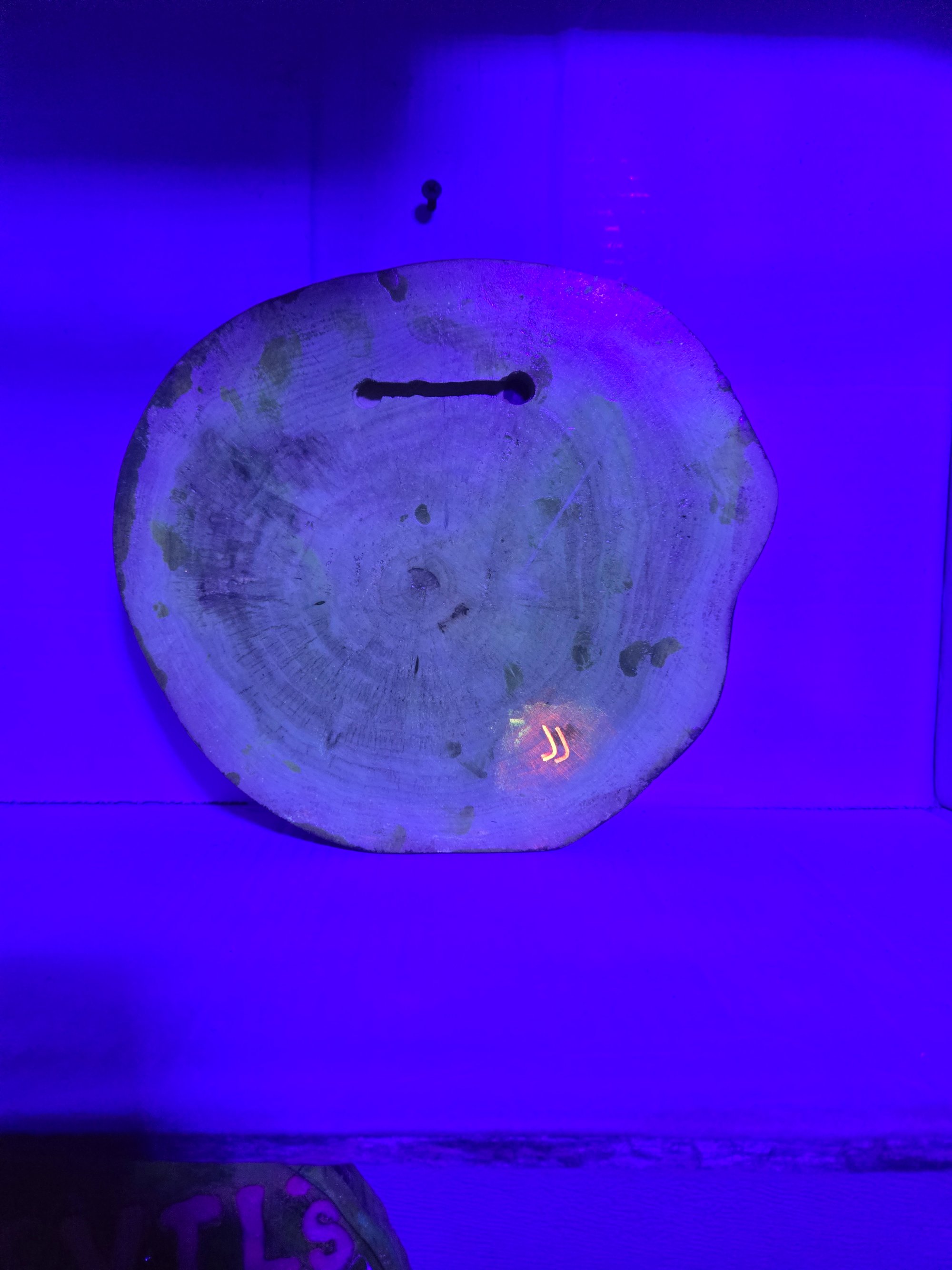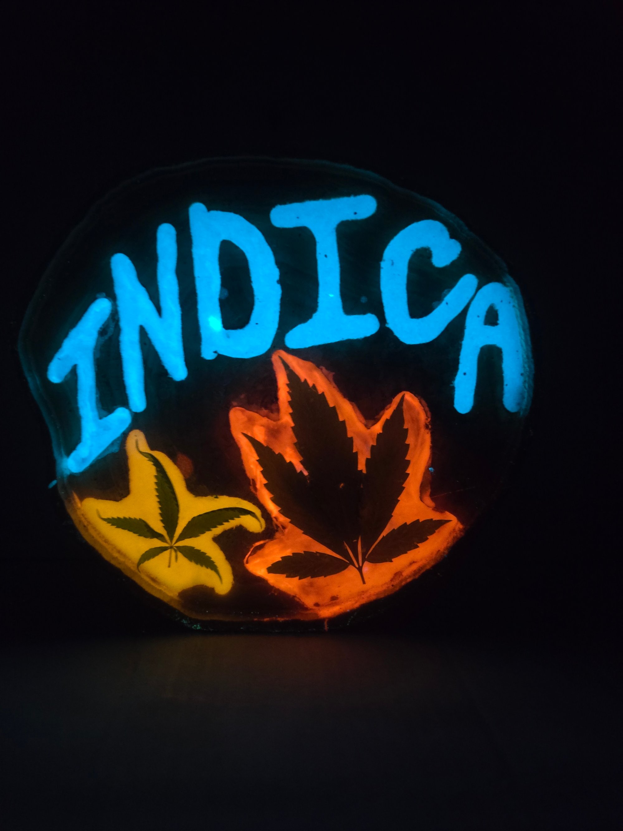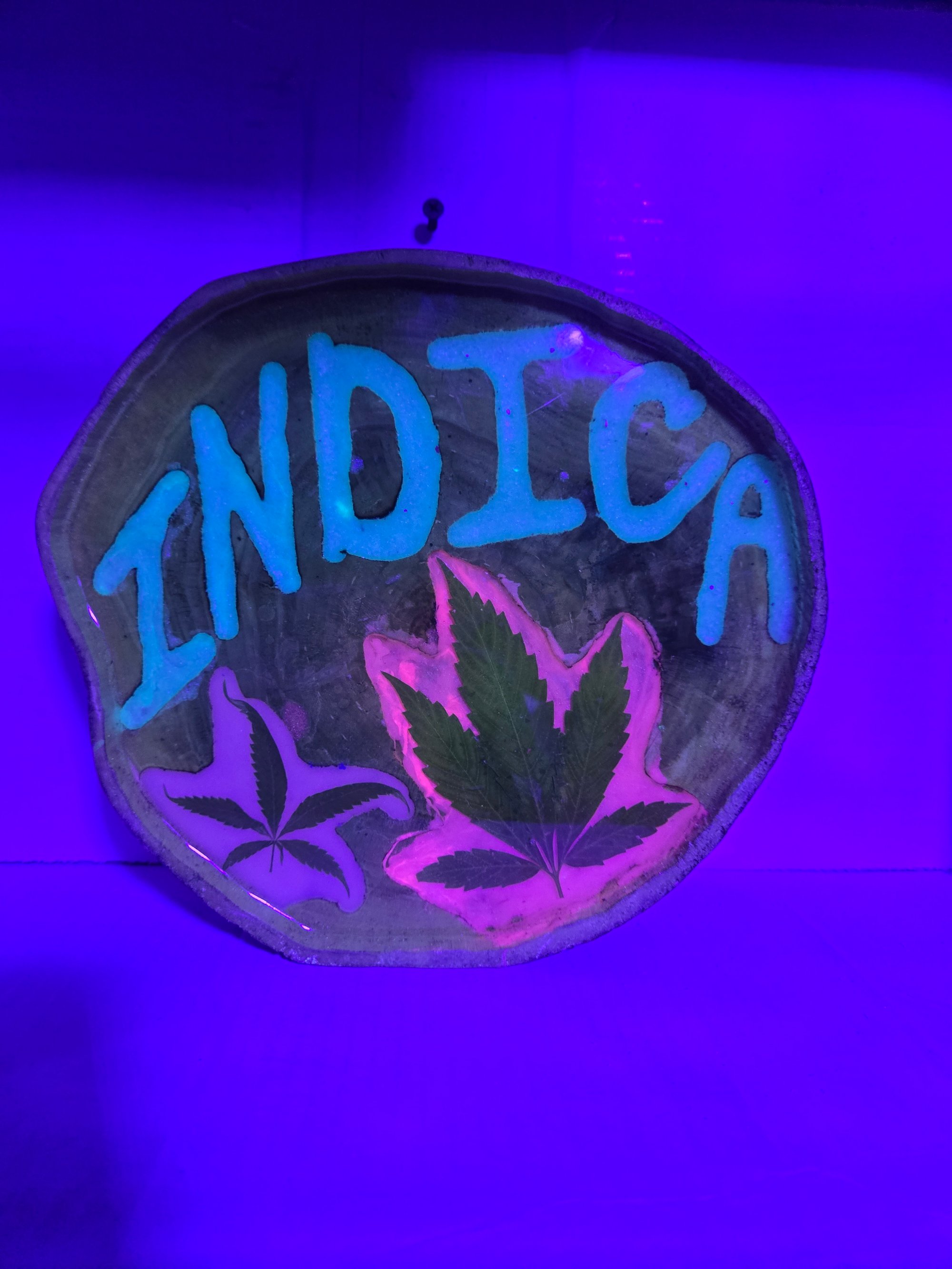 Handcrafted wood tray that glows in the dark and has real cannabis leaves encased in epoxy