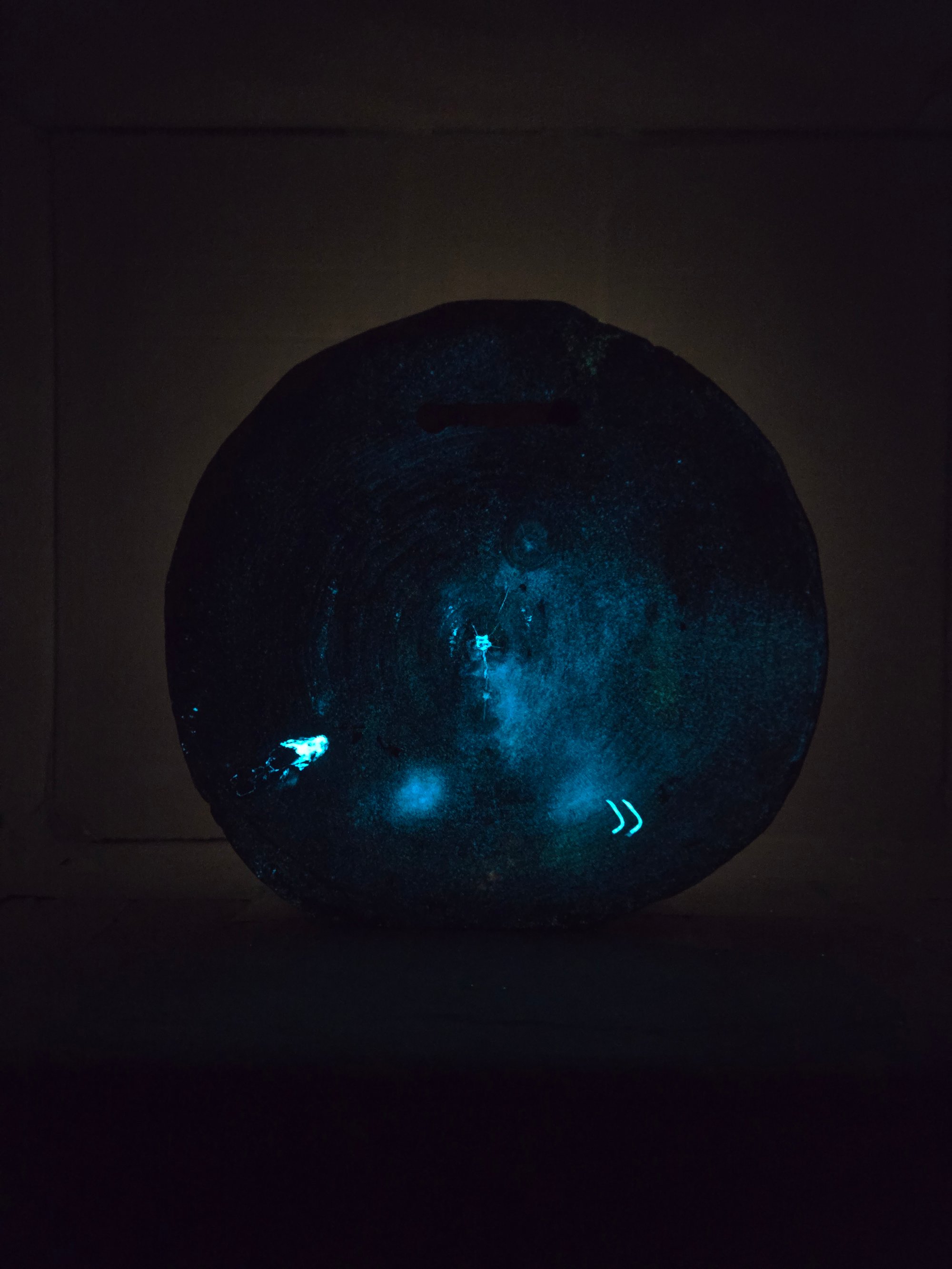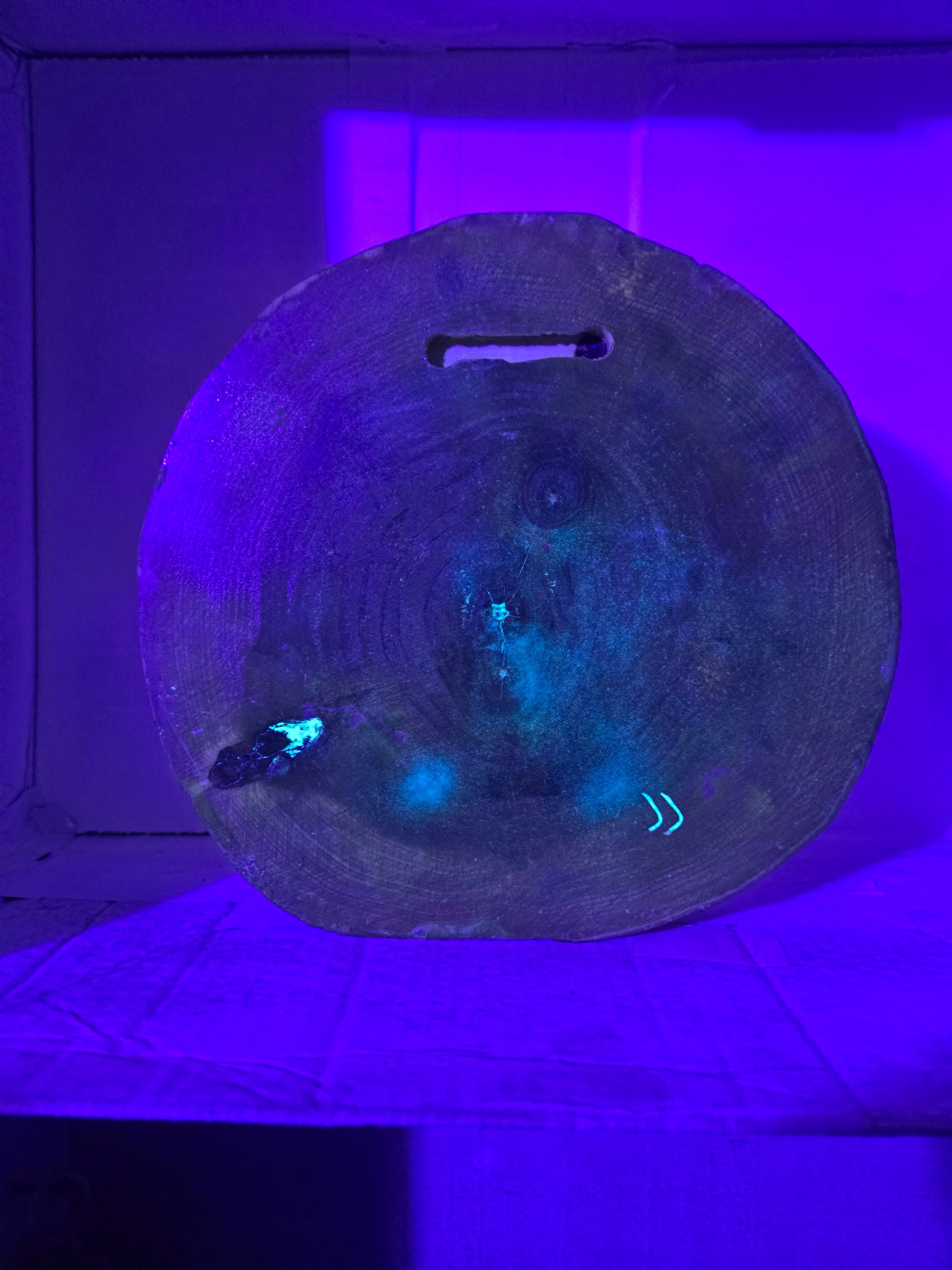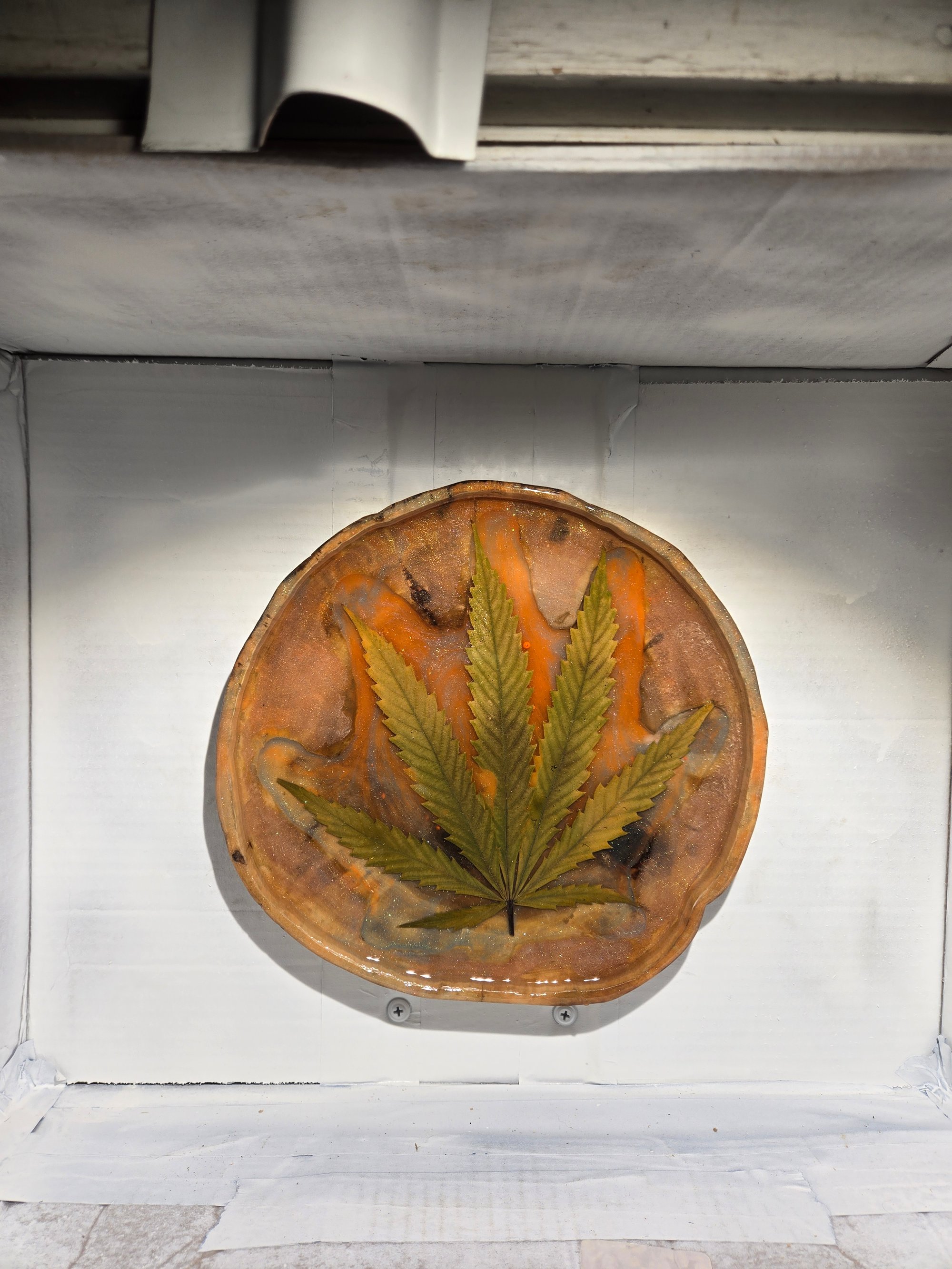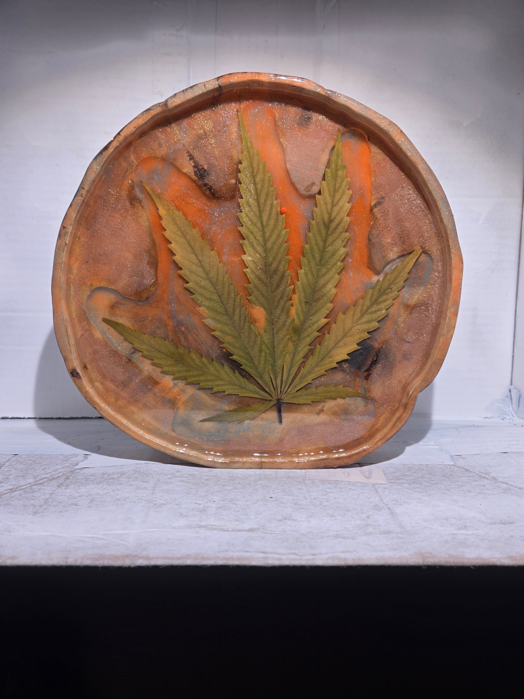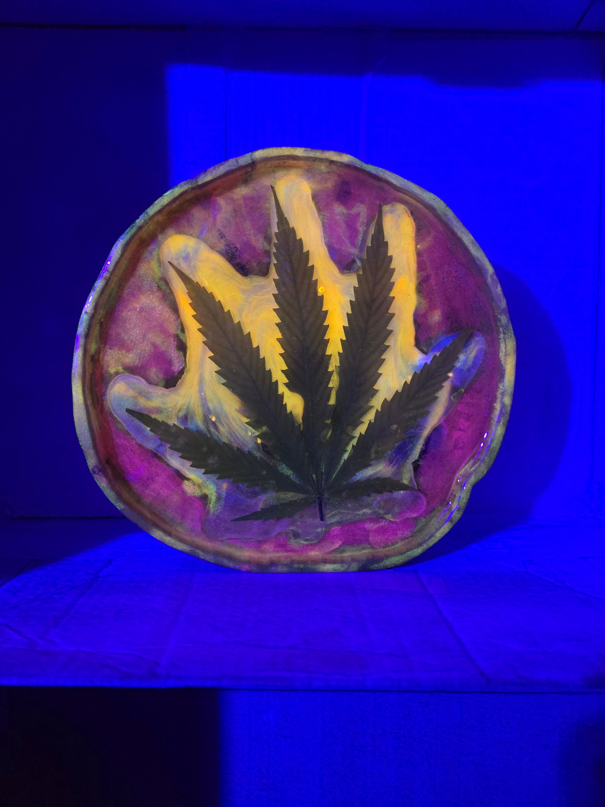 Handcrafted wood tray that glows in the dark and has real cannabis leaves encased in epoxy