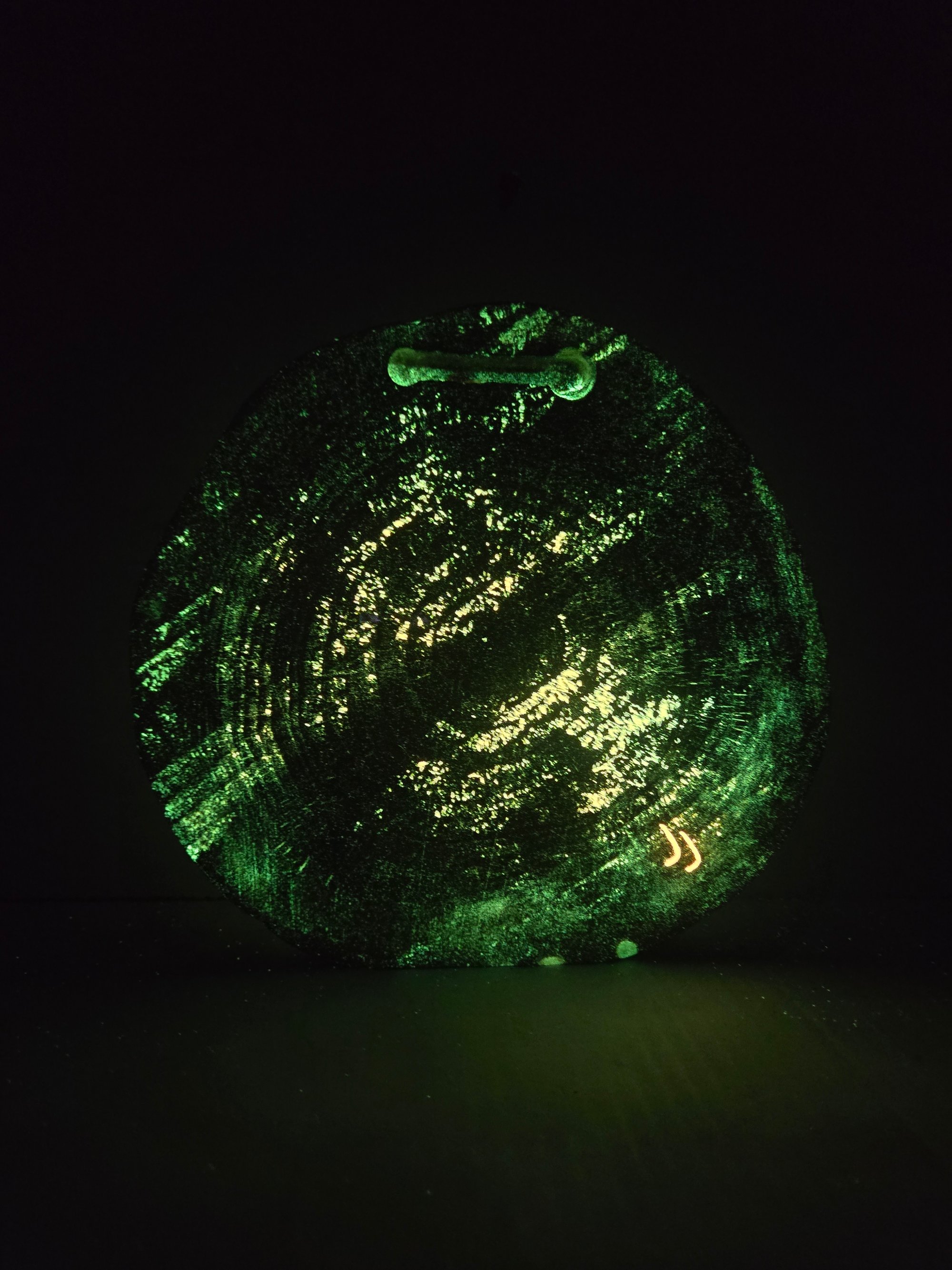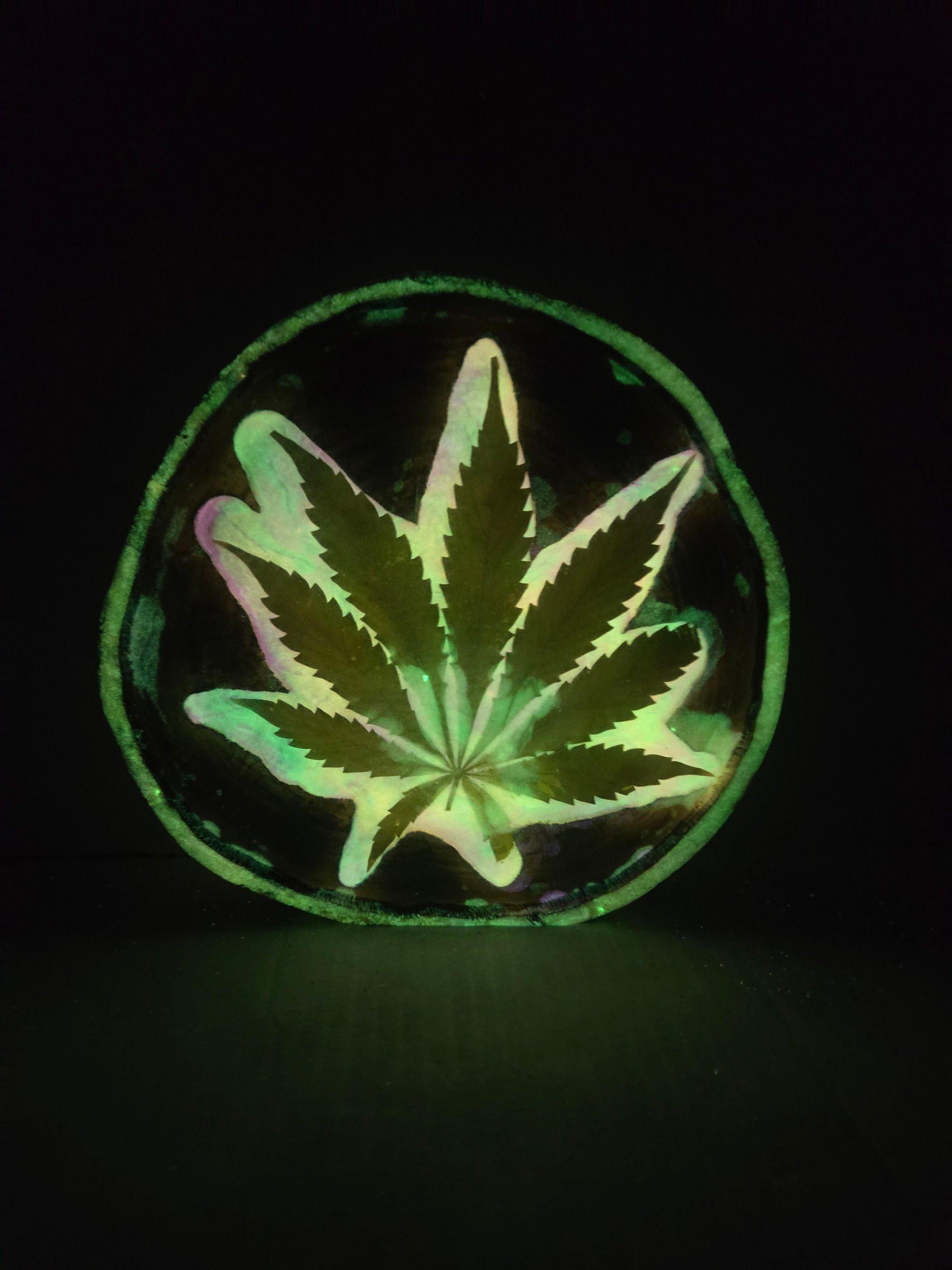 Handcrafted wood tray that glows in the dark and has real cannabis leaves