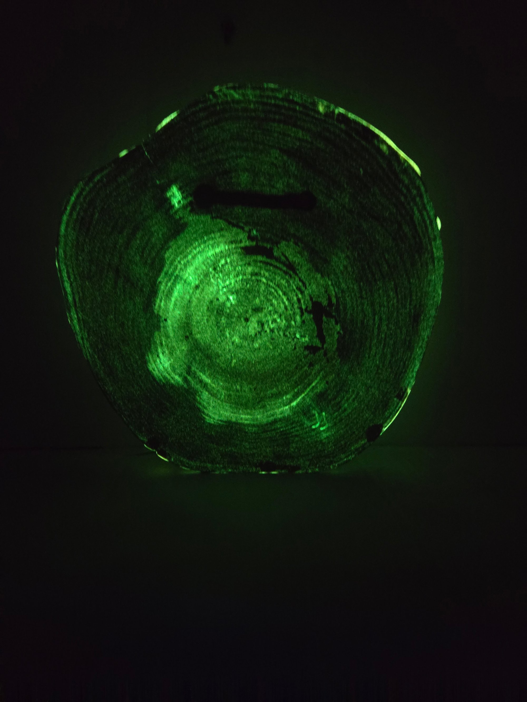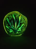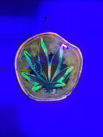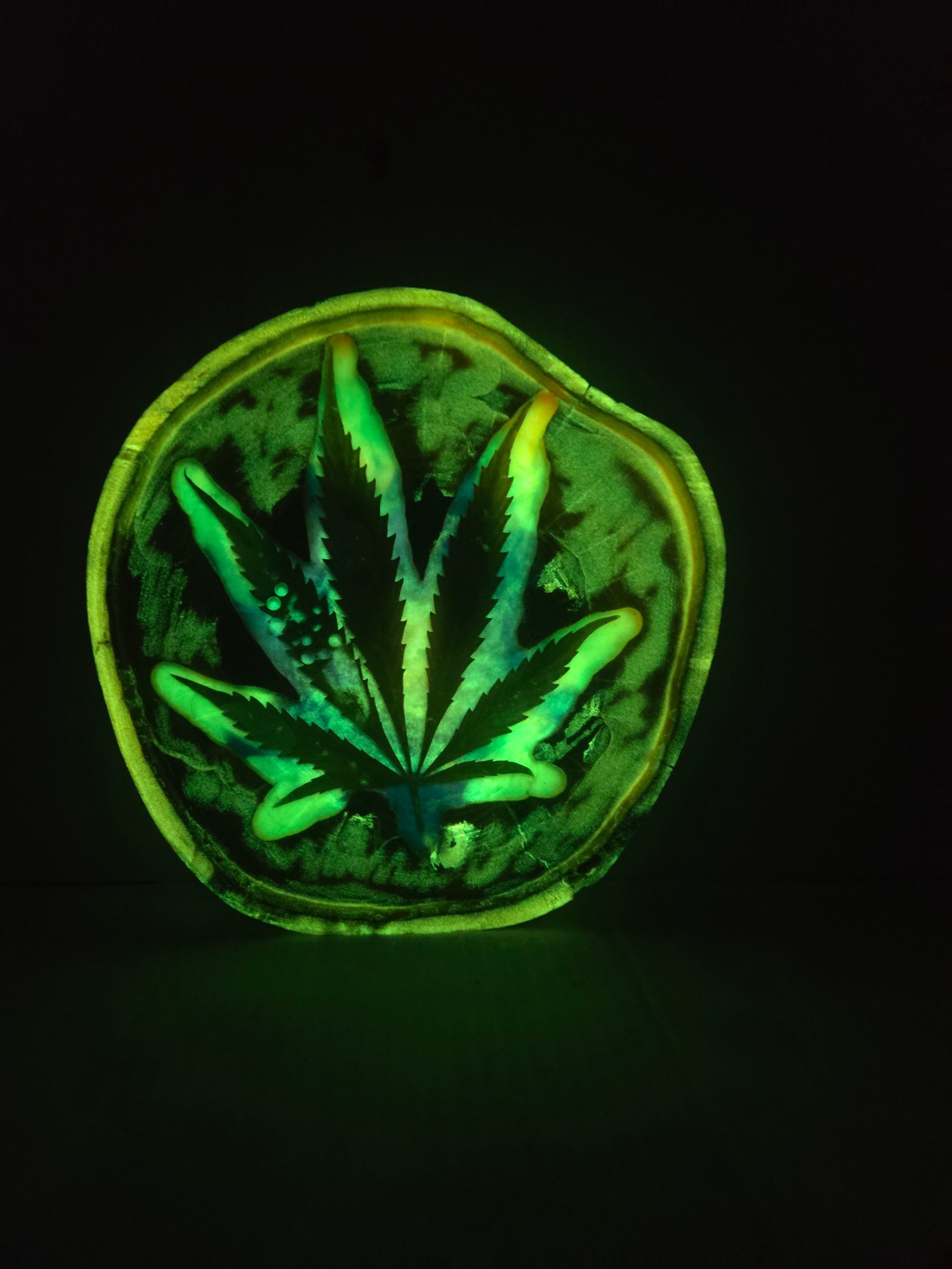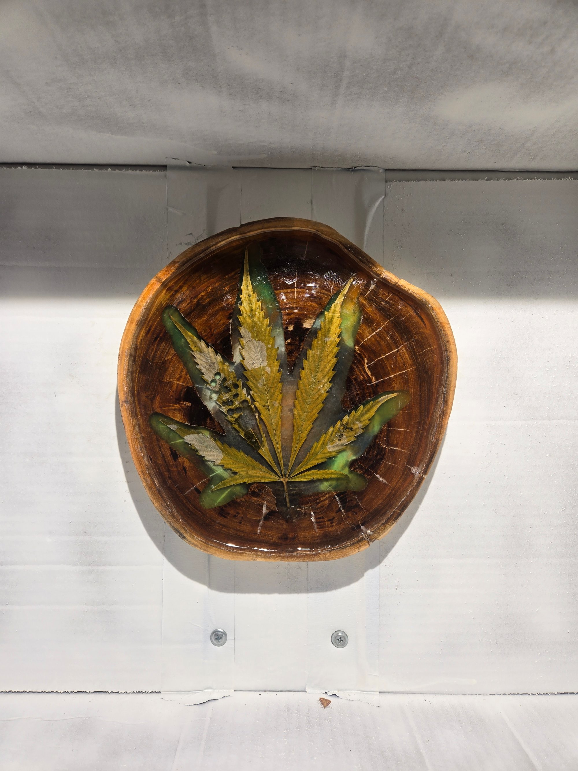 Handcrafted wood tray that glows in the dark and has real cannabis leaves encased in epoxy