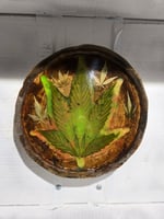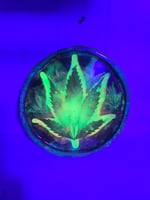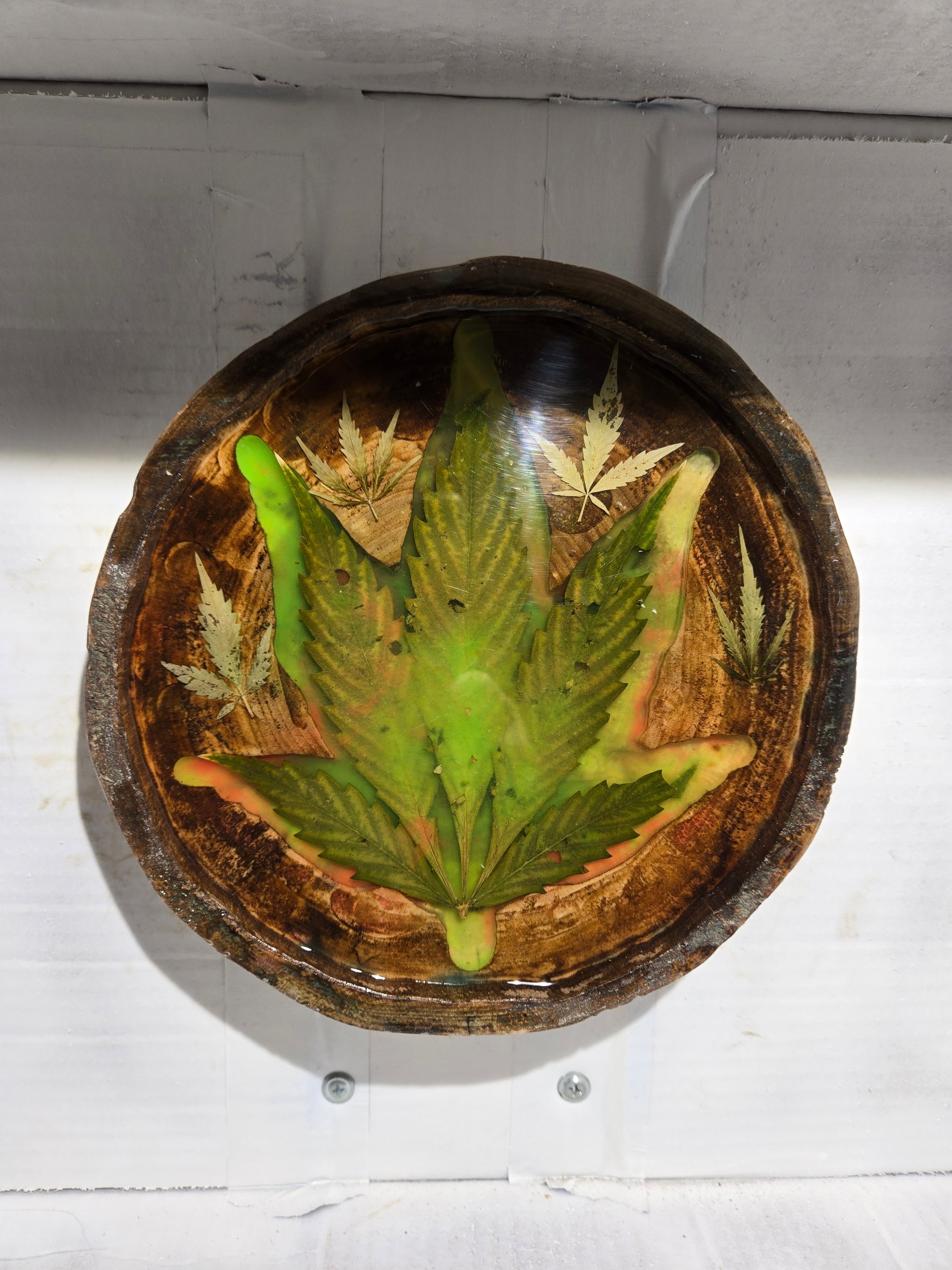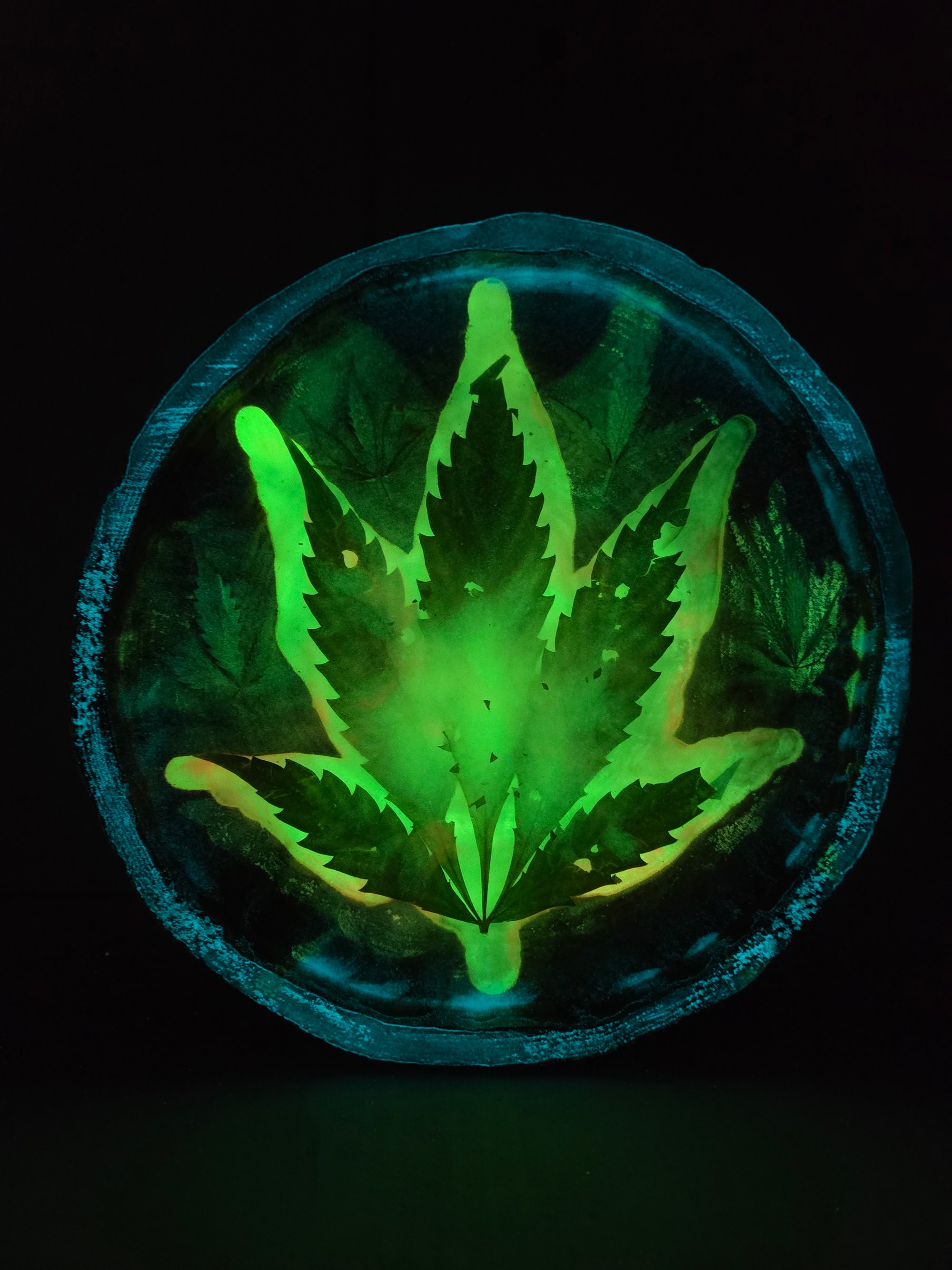 Handcrafted wood tray that glows in the dark and has real cannabis leaves encased in epoxy