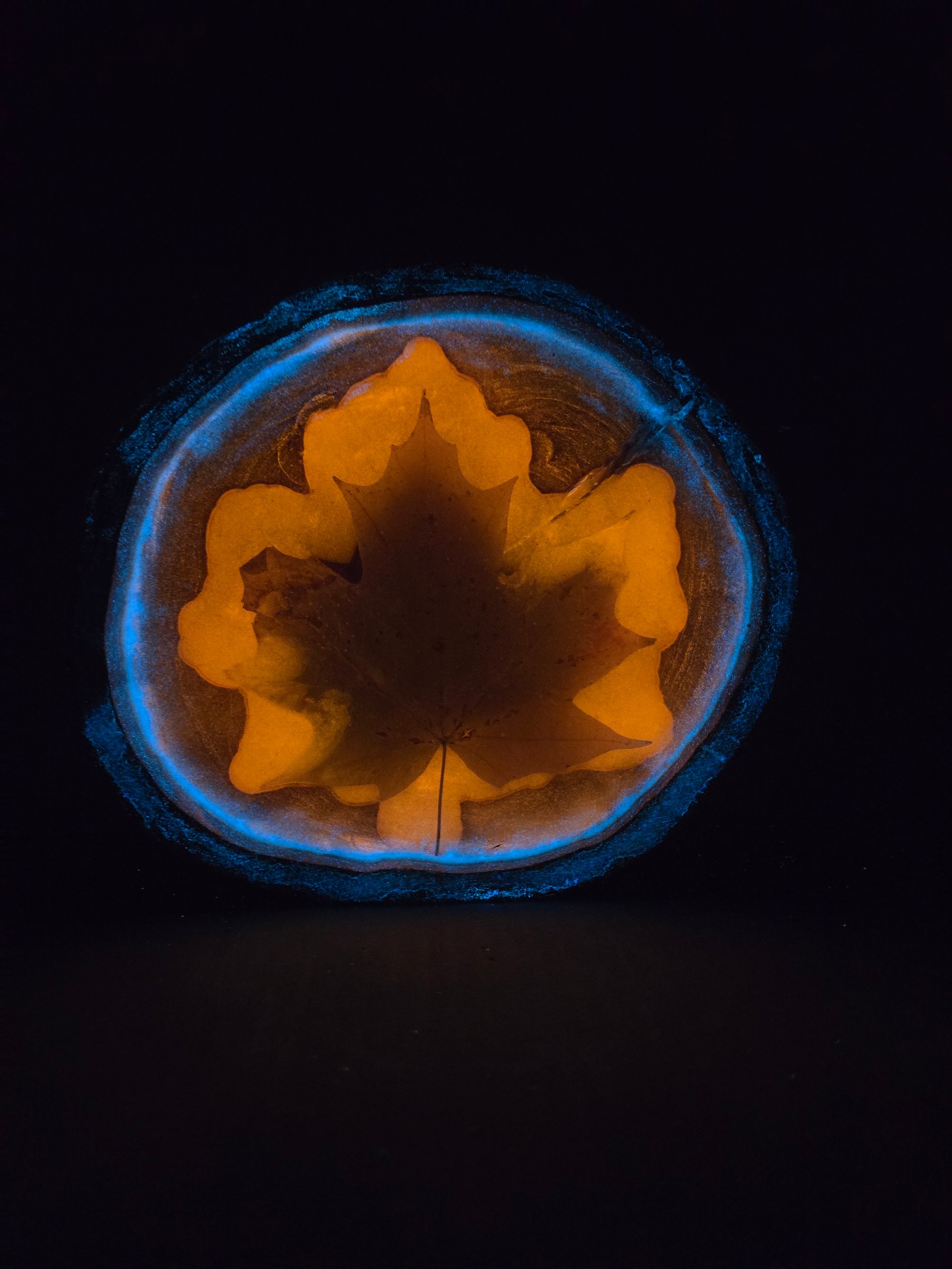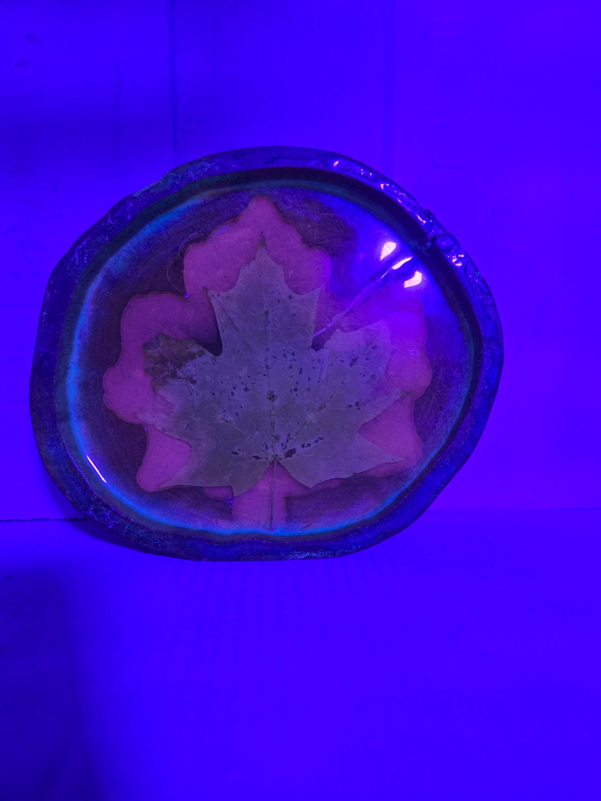 Handcrafted wood tray that glows in the dark and has real maple leaves encased in epoxy