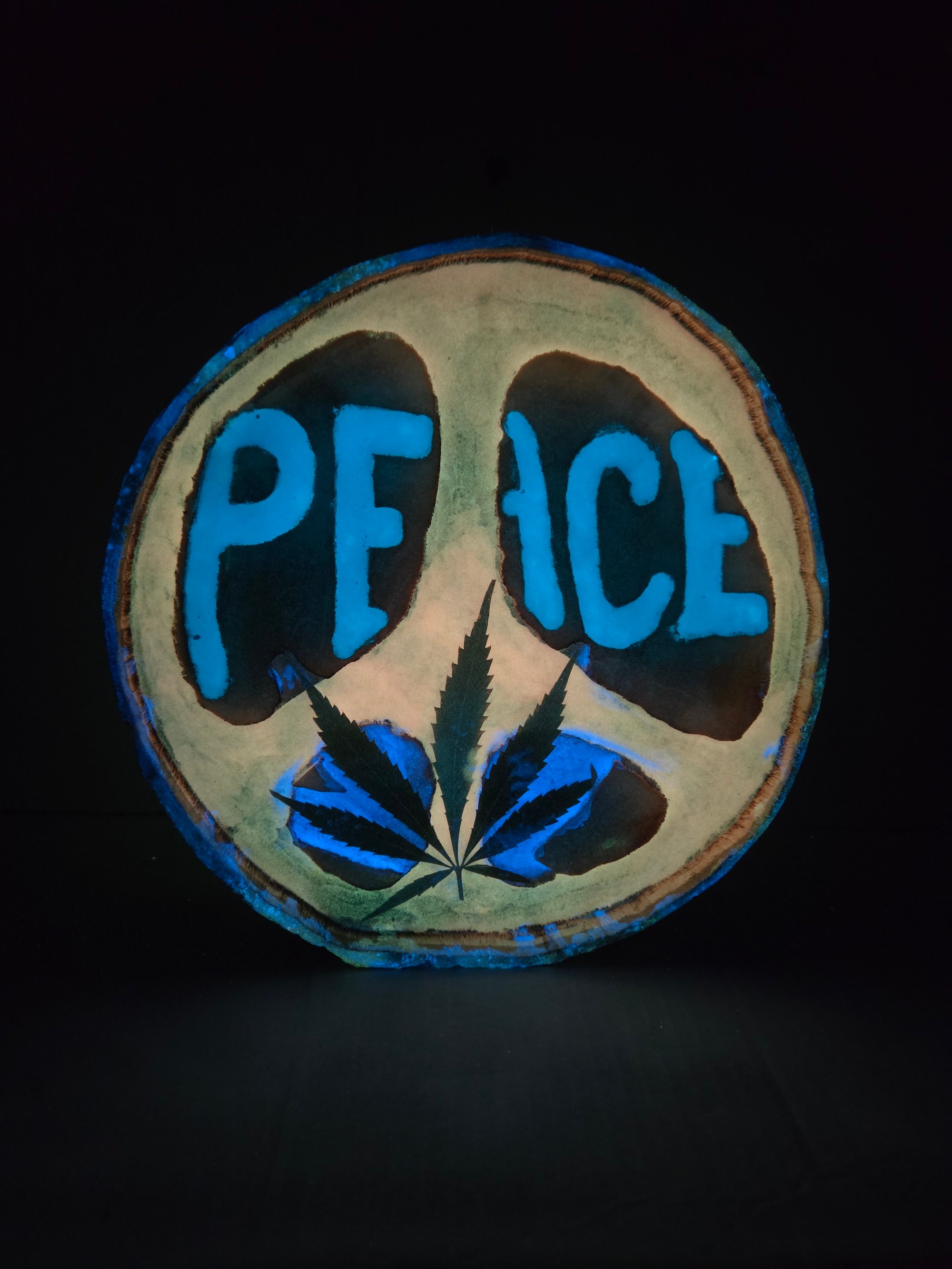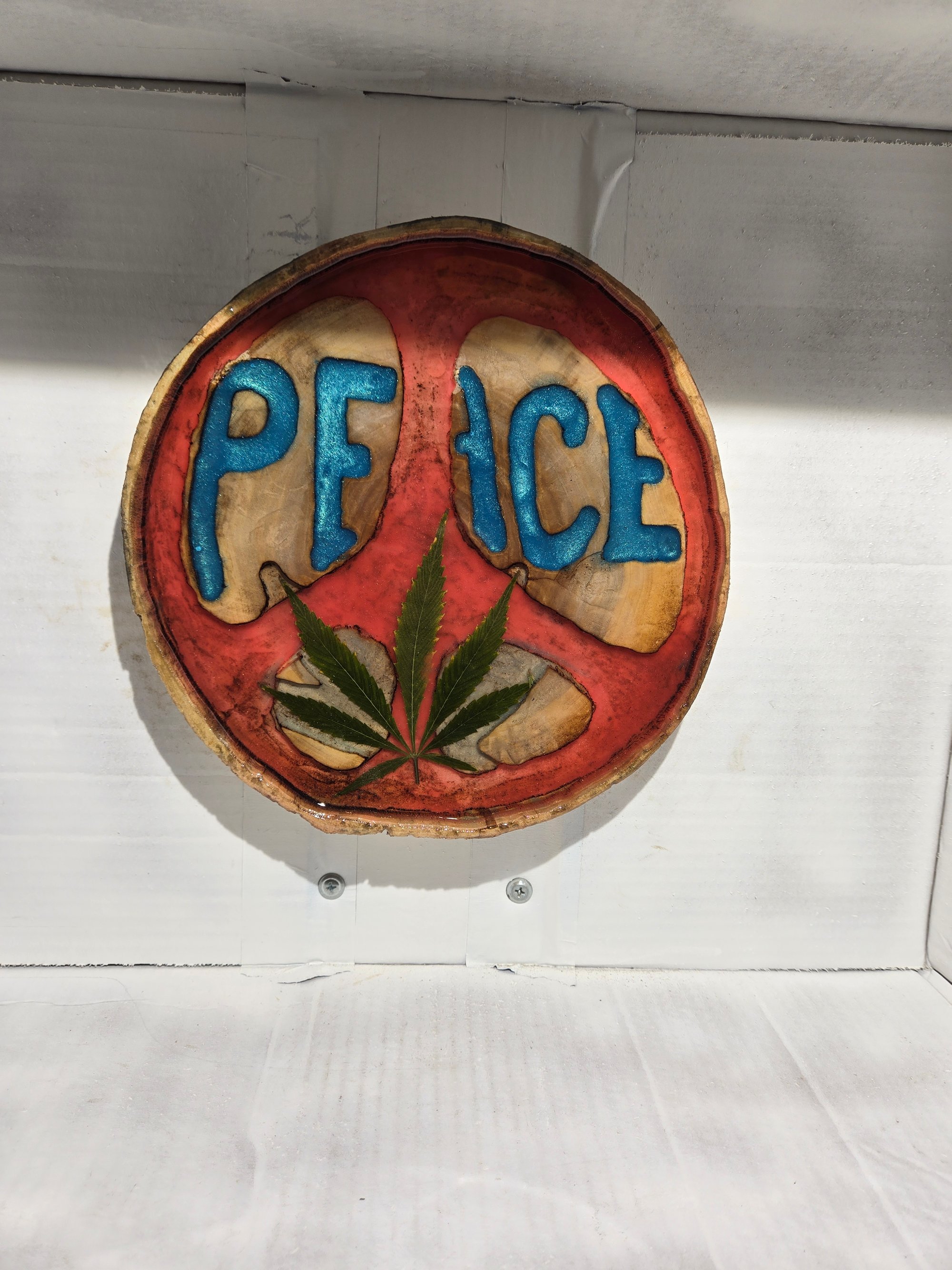 Handcrafted wood tray that glows in the dark and has real cannabis leaves encased in epoxy