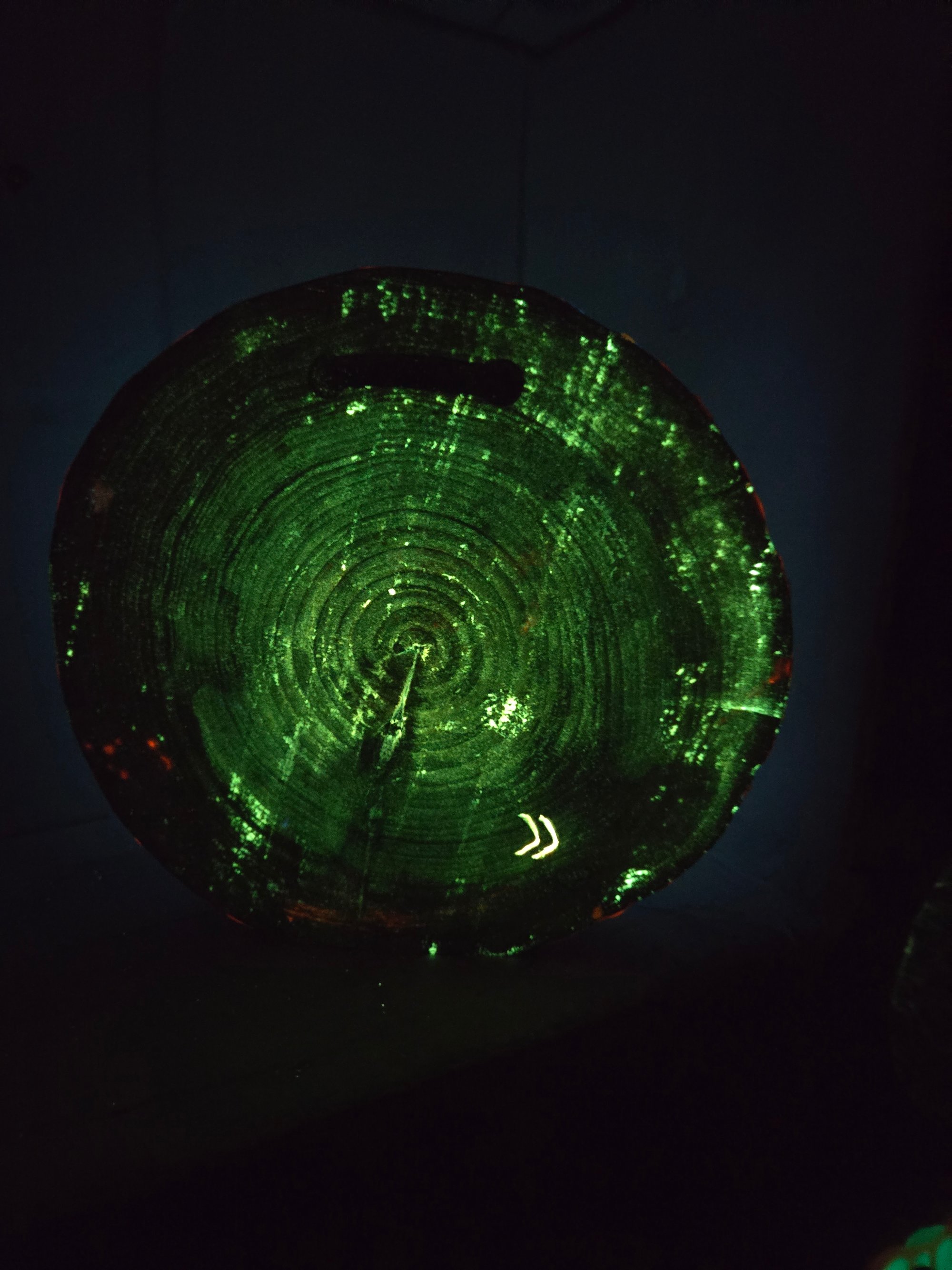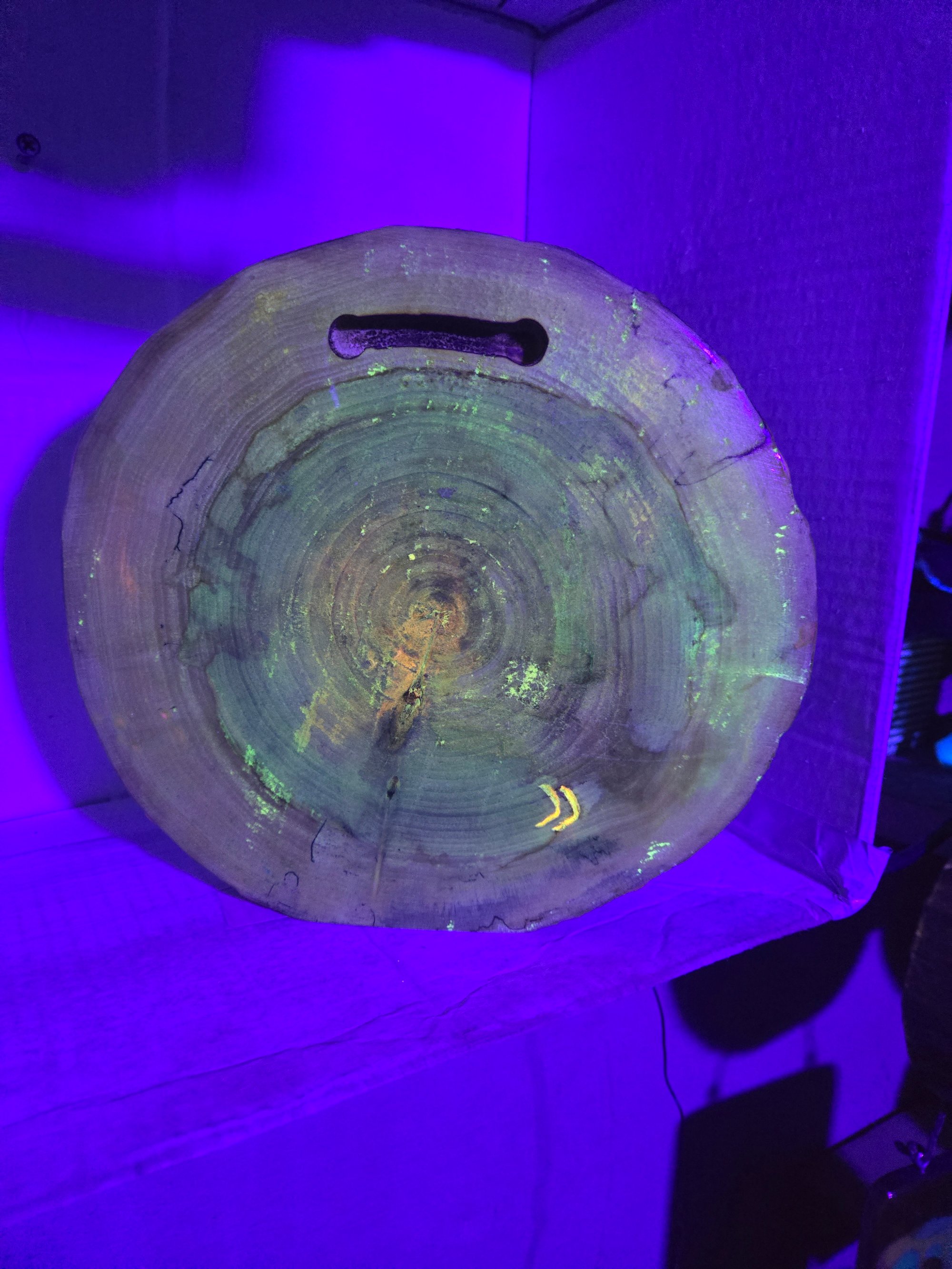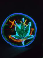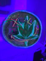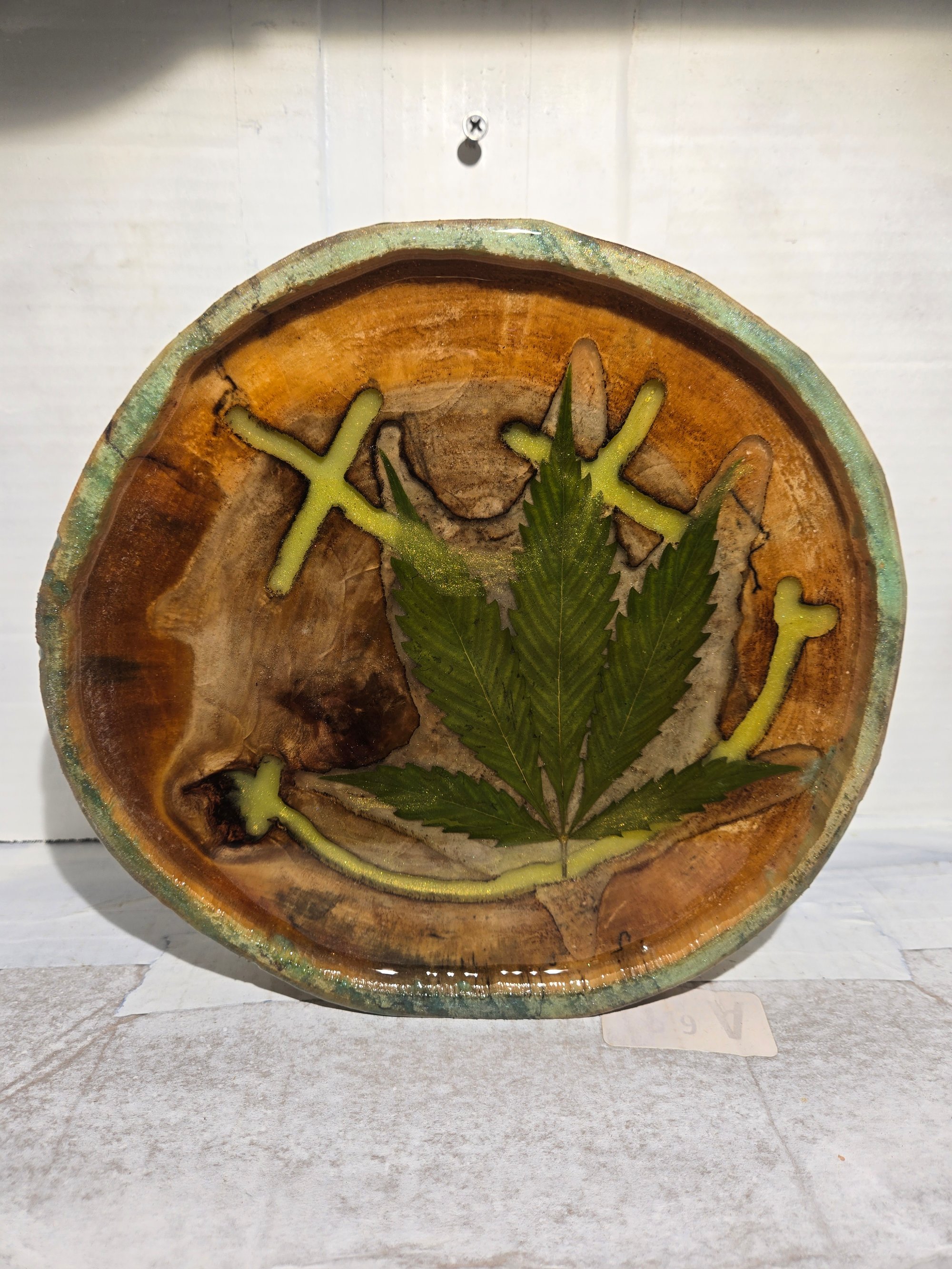 Handcrafted wood tray that glows in the dark and has real cannabis leaves encased in epoxy