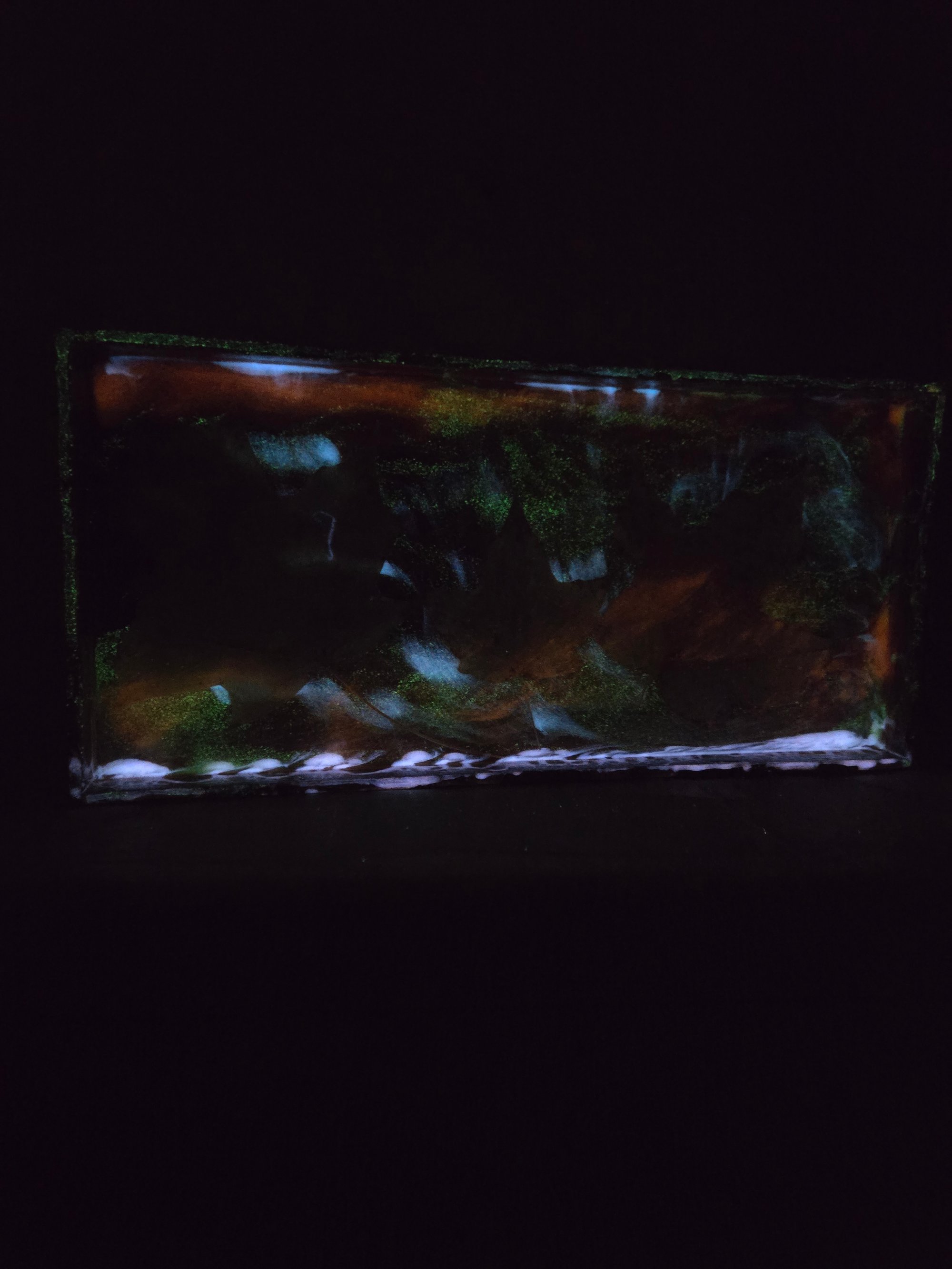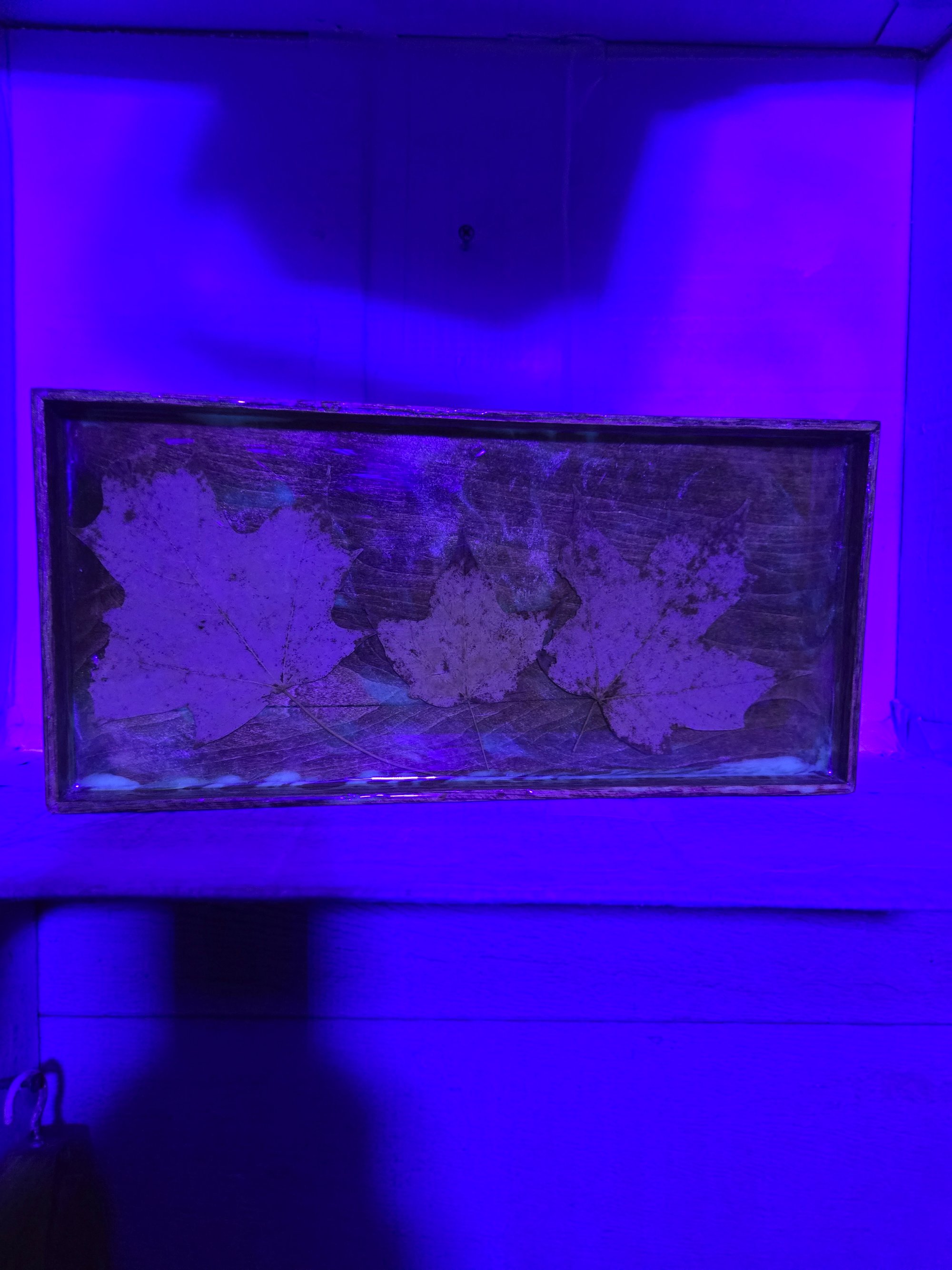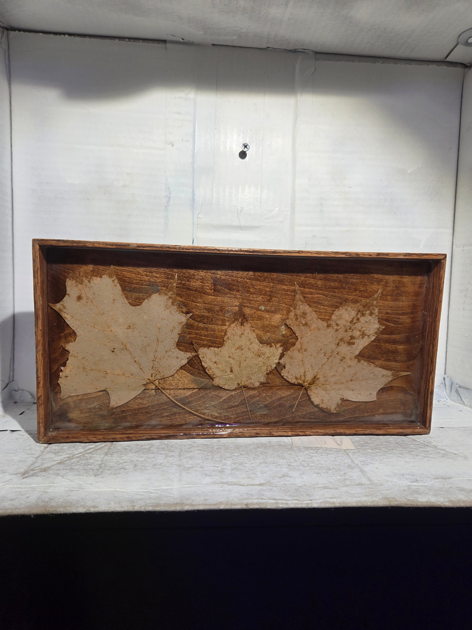 Handcrafted wood tray that glows in the dark and has real maple leaves encased in epoxy