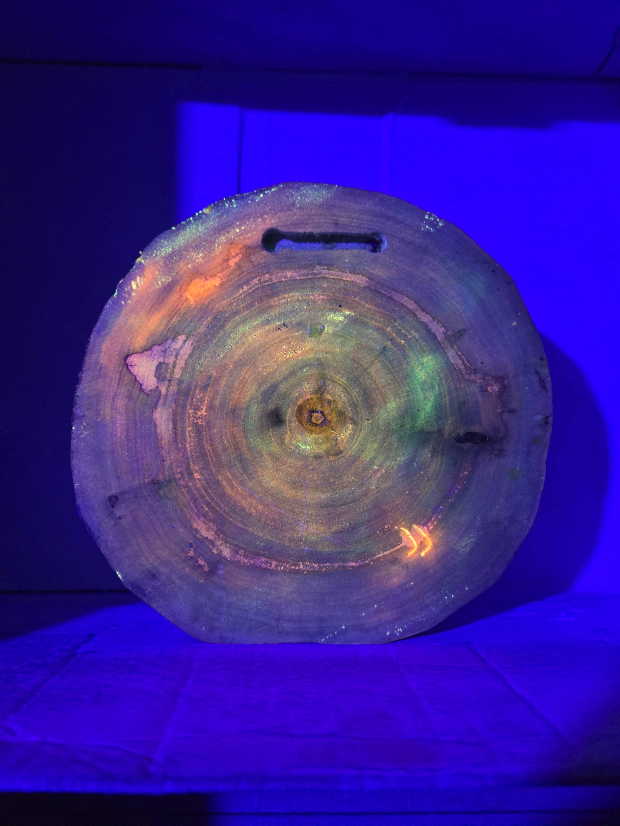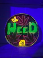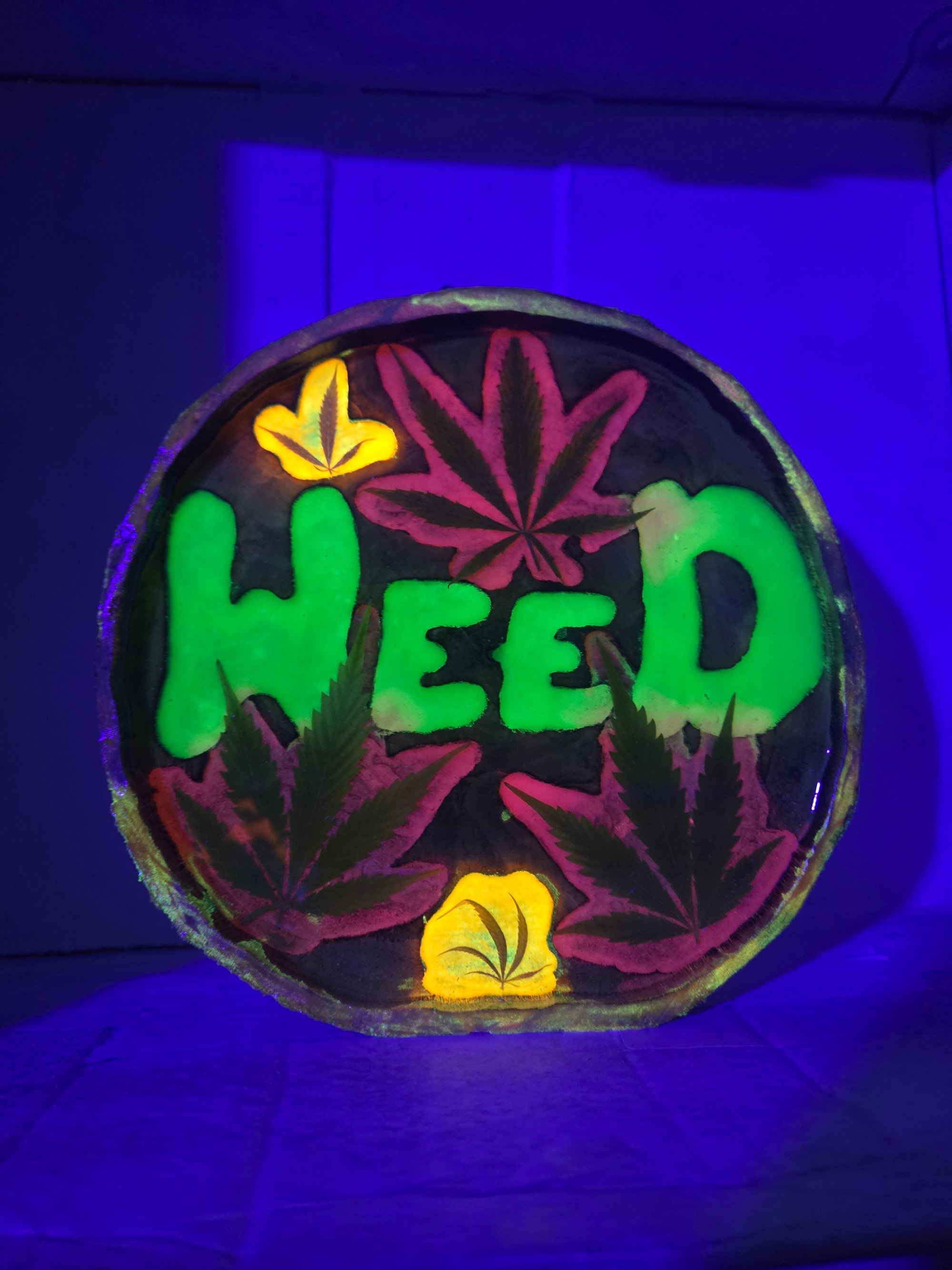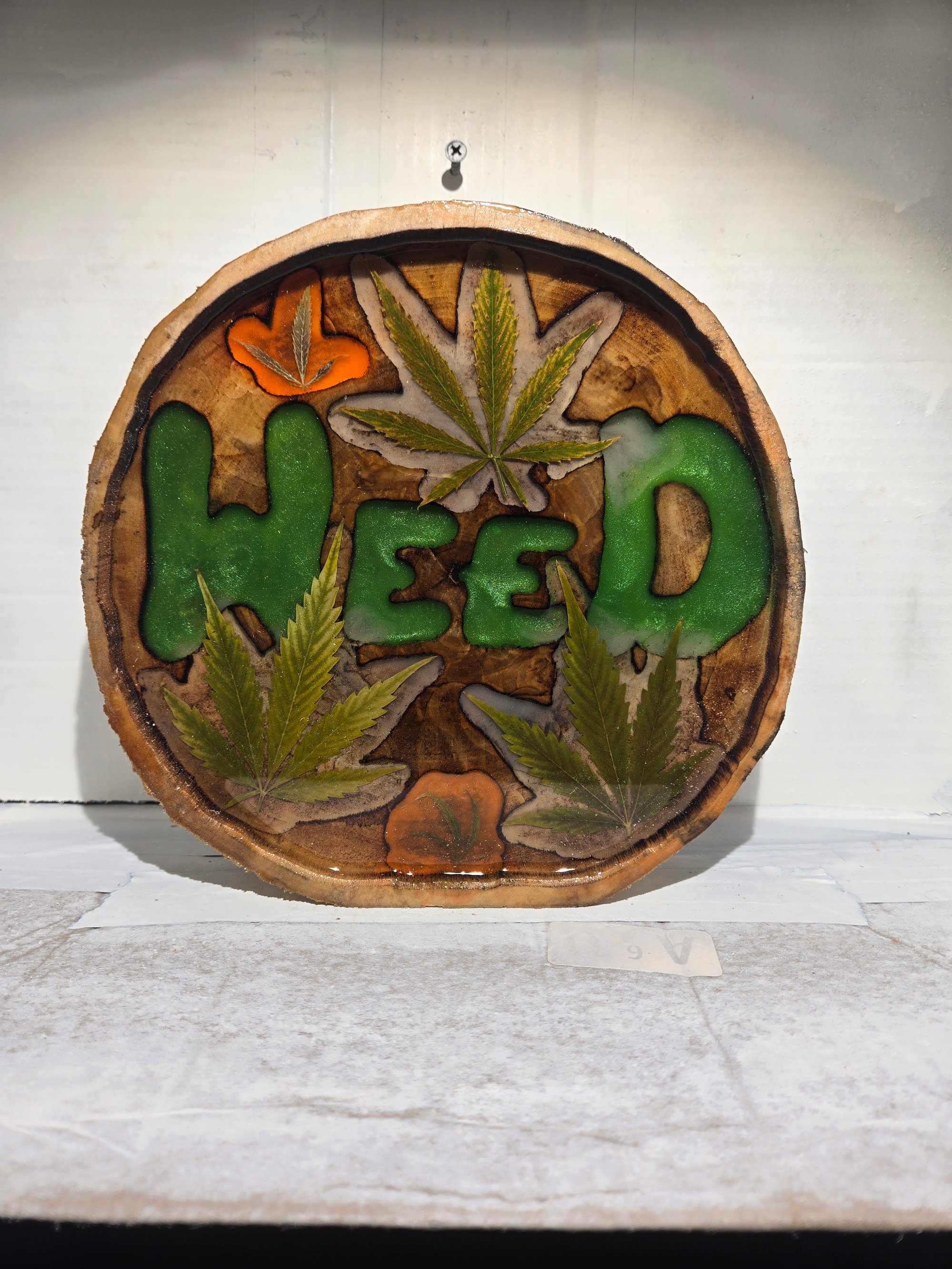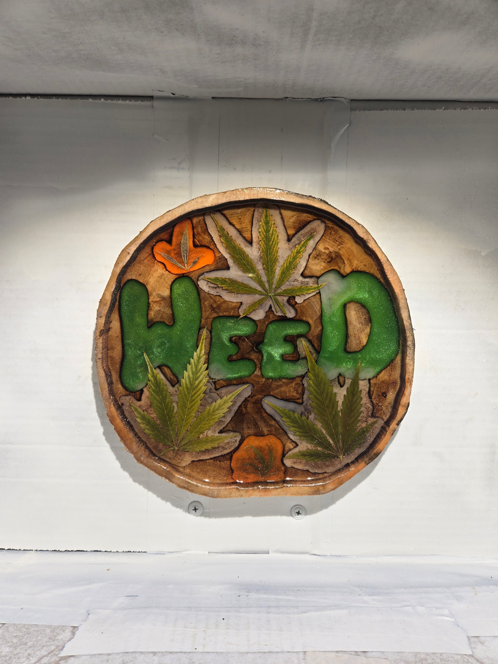 Handcrafted wood tray that glows in the dark and has real cannabis leaves encased in epoxy